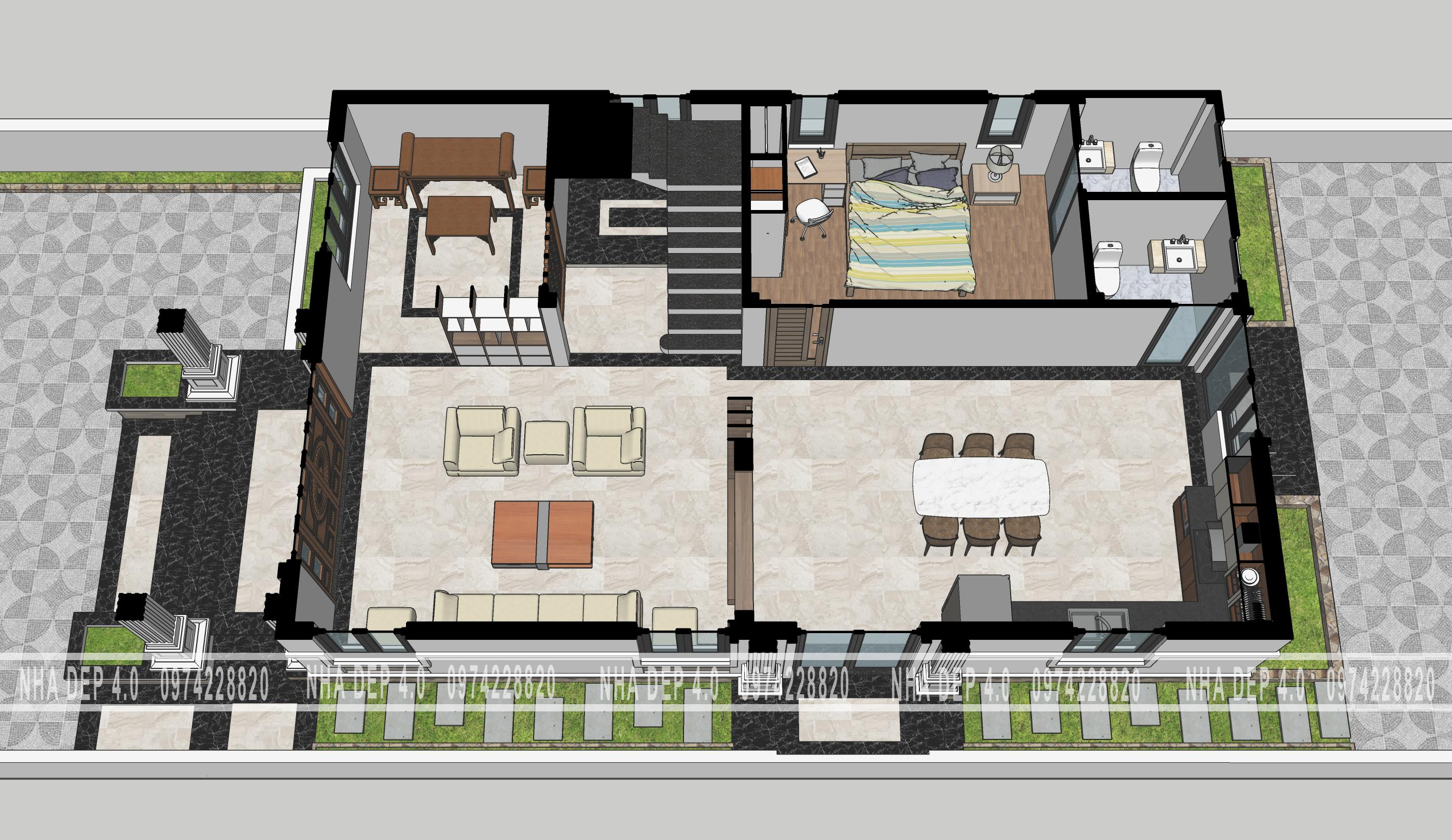Phối cảnh bố trí công năng + nội thất biệt thự tầng 1