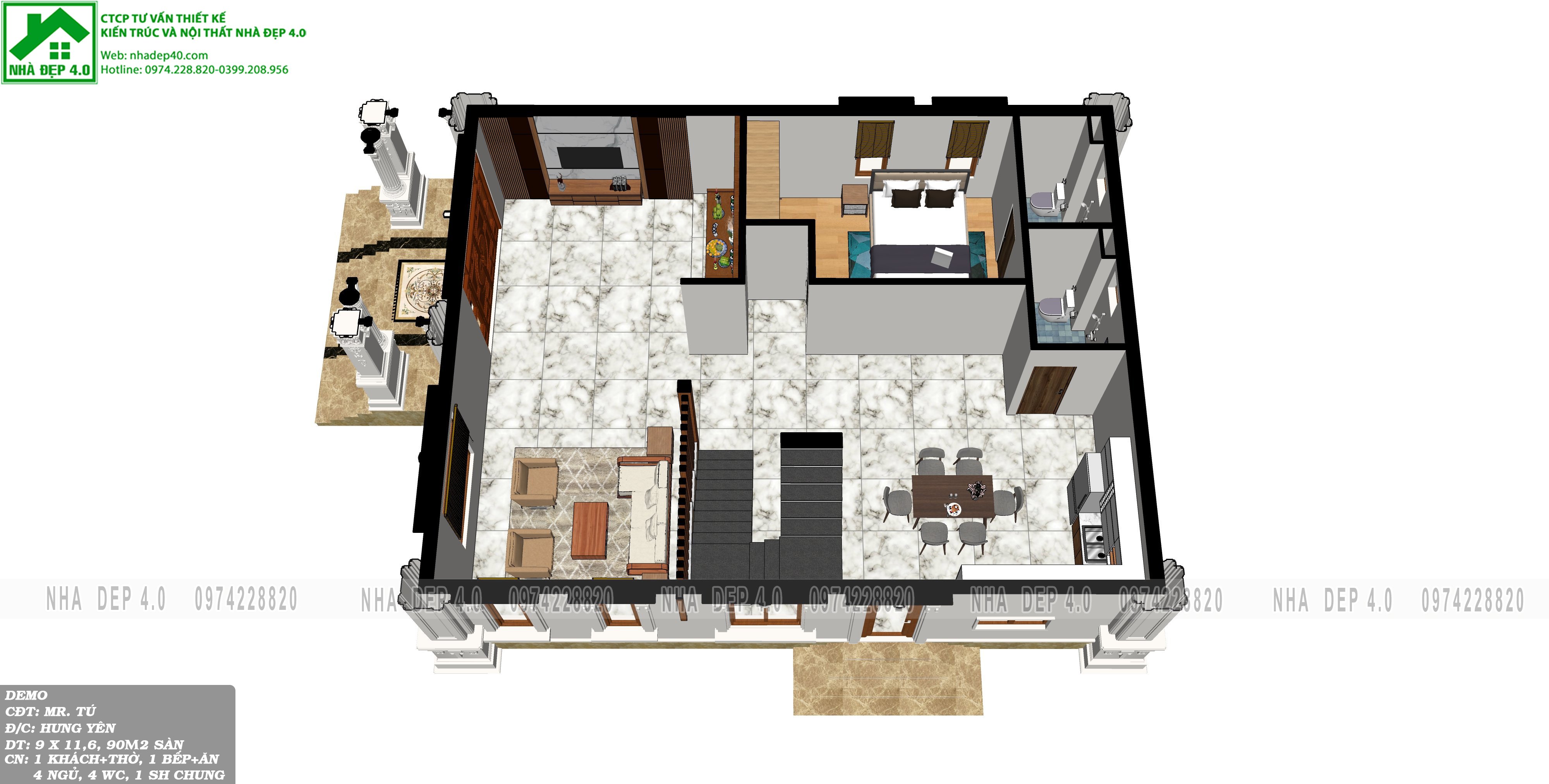 - Công năng: 4 phòng ngủ, 1 phòng khách, 1 phòng thờ, 1 phòng bếp, 1 phòng sinh hoạt chung.