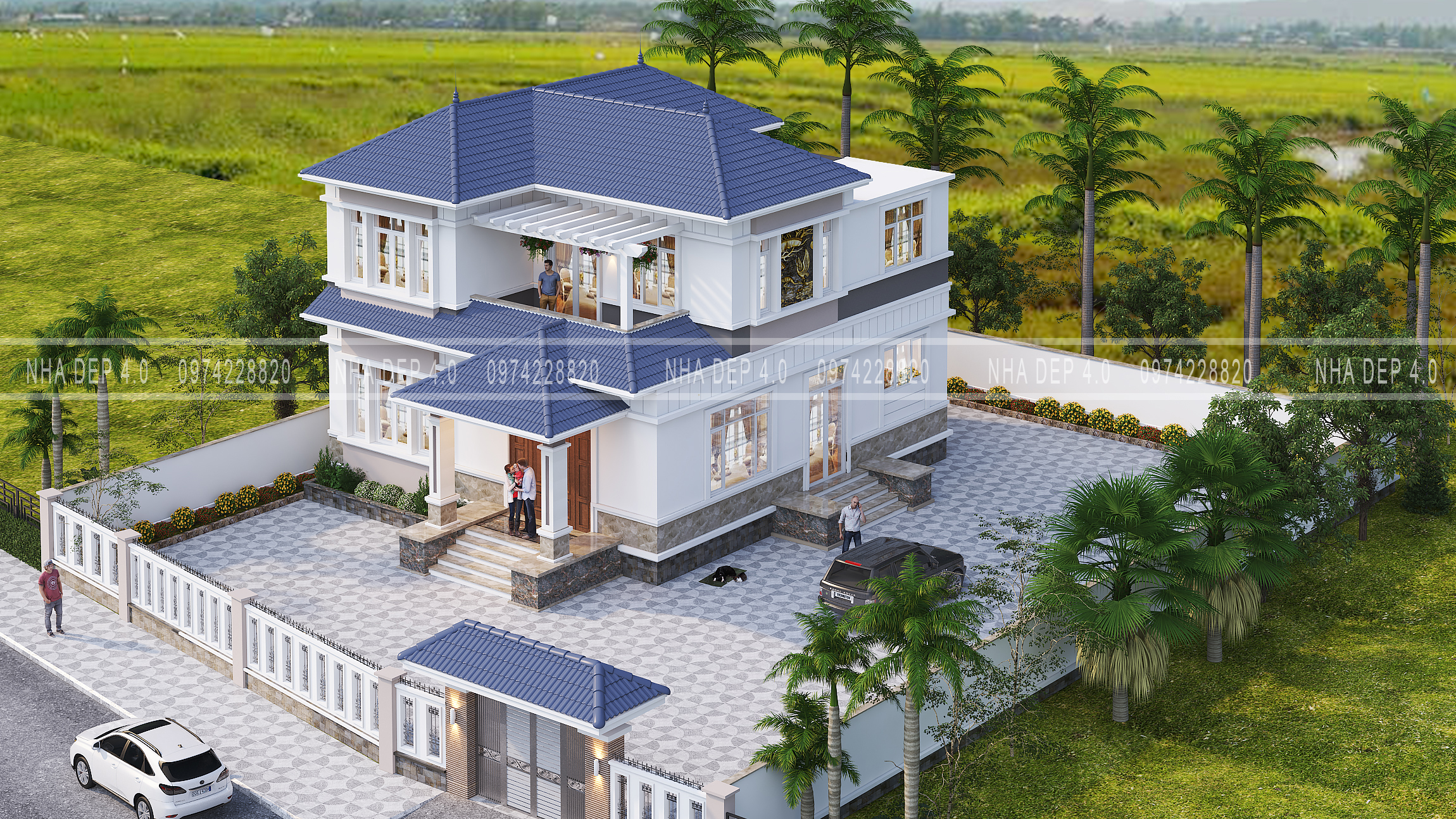 Mái ngói màu xanh dương kết hợp cùng tone màu trắng sứ nhẹ nhàng sẽ tạo nên sự liên kết nổi bật và hơi hướng hiện đại. Ngoài ra, ngôi nhà còn được sử dụng màu ghi tạo điểm nhấn trên các phần phân tầng, đầu cột. Thân nhà còn được bật lên bởi những gờ đắp nổi chạy xung quanh thân nhà và tạo điểm nhấn mạnh cho các hệ thống cửa sổ.