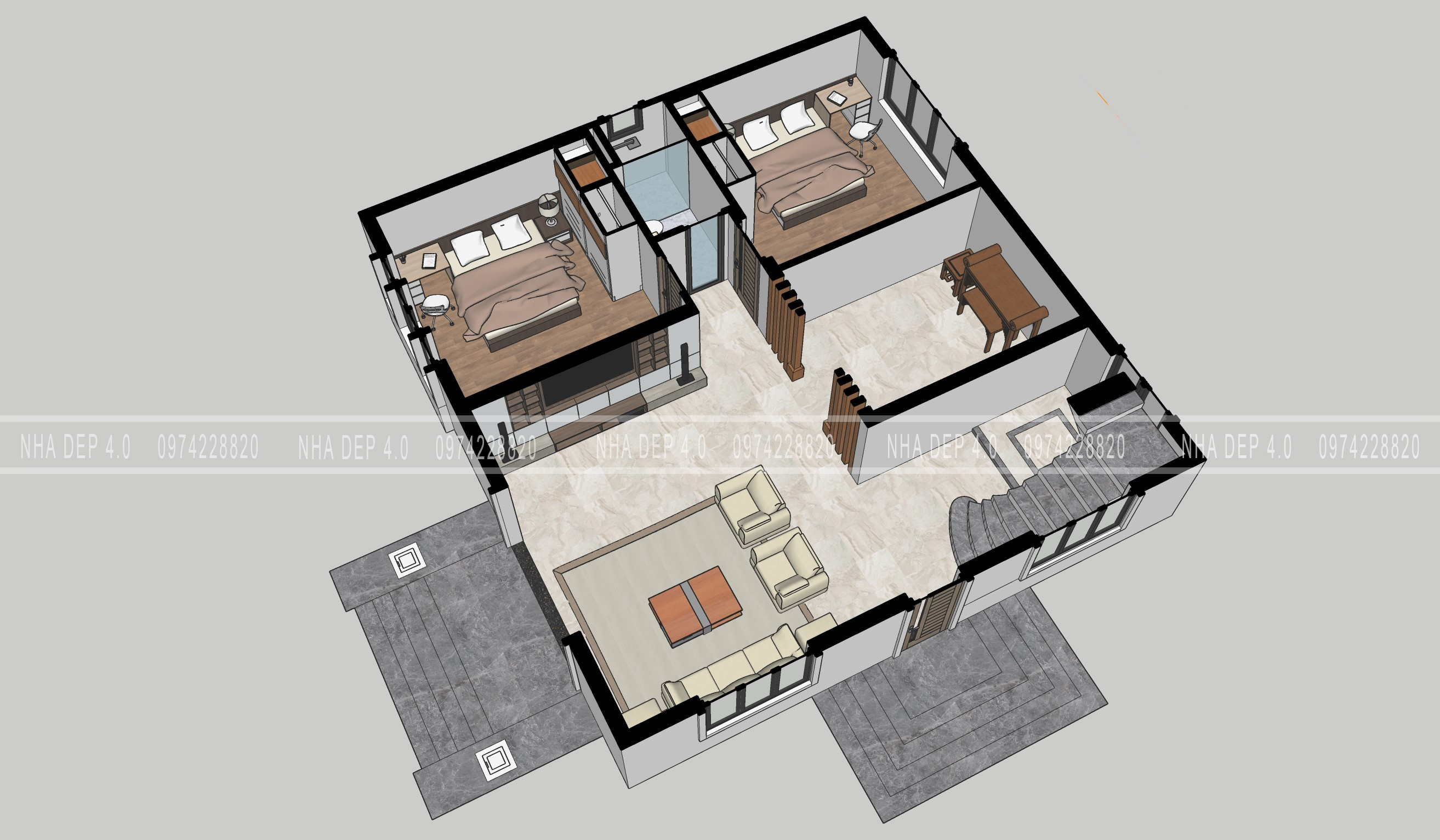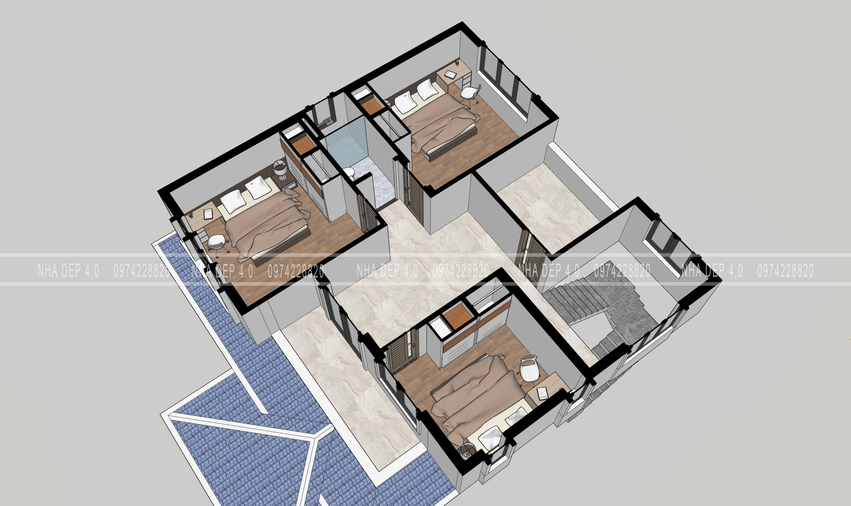 Phối cảnh bố trí công năng + nội thất biệt thự tầng 2