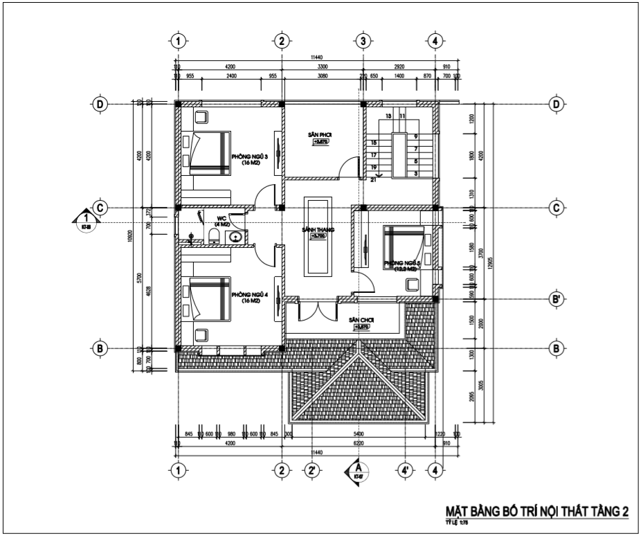 Tầng 2 được phân chia bố cục tương tự, với 2 phòng ngủ phía bên trái (16m2) và 1 sân phơi gần 4m2. Bên phải có 1 phòng ngủ nhỏ hơn (15,5m2). Và cuối cùng là 1 ban công – sân chơi bên ngoài, đáp ứng đúng nhu cầu của anh Dự. Sân chơi được bố trí hệ lam làm dàn hoa càng tăng thêm độ gần gũi với thiên nhiên cho công trình.