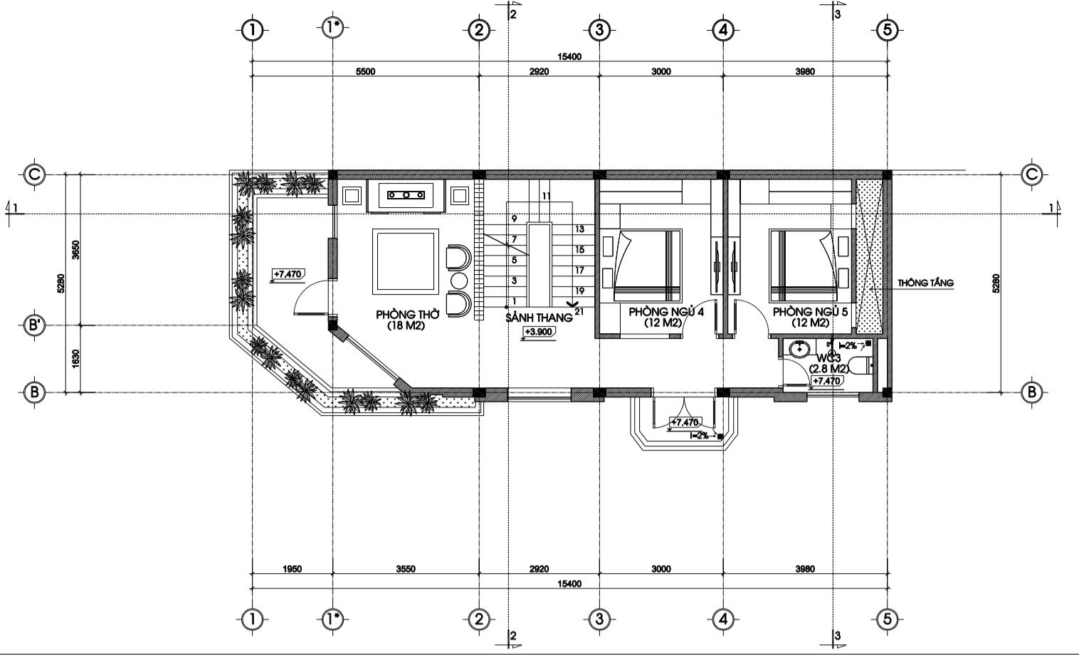 Công năng tầng 3 là 2 phòng ngủ còn lại (12m2) và 1 phòng thờ (18m2) có ban công riêng.