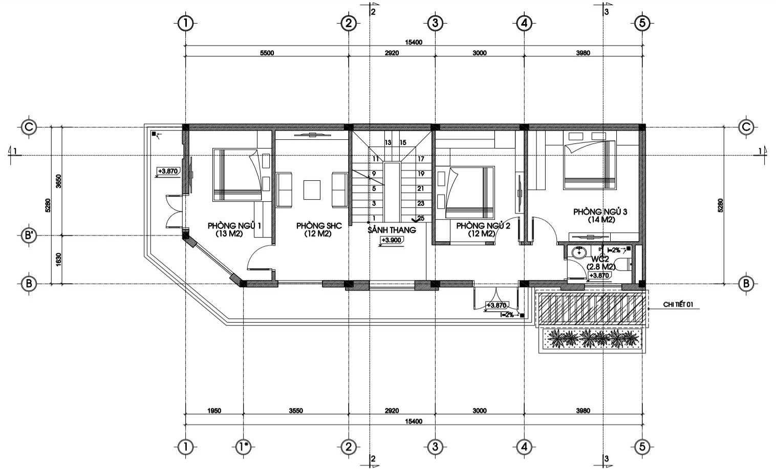 Lên trên tầng 2 bên trái bố trí 2 phòng ngủ (12m2 và 14m2) và bên phải là 1 phòng ngủ (13m2) + 1 khu vực sinh hoạt chung (12m2). Ban công được trái dài theo mặt tiền, tạo không gian mở giúp công trình trở nên thoáng đãng hơn.
