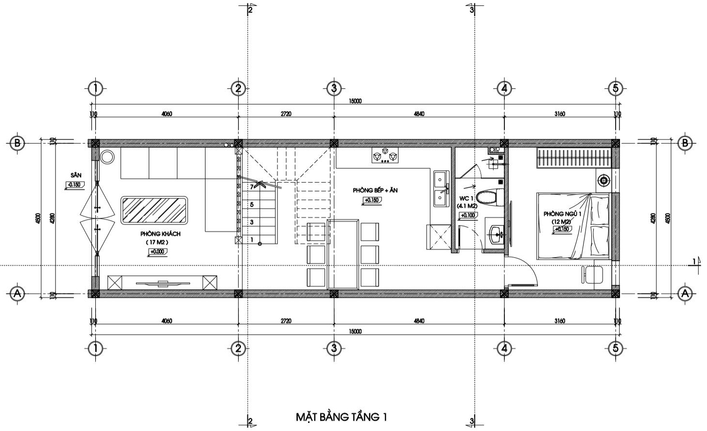 - Gia đình muốn thi công mẫu nhà phố với diện tích 4,5m x 15m.