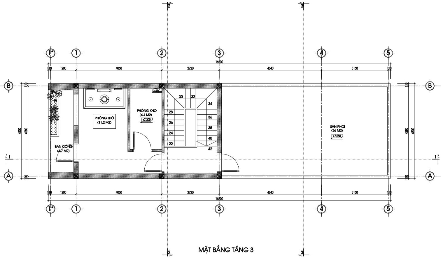 Mặt bằng tầng 3 nhà phố 4,5x15m