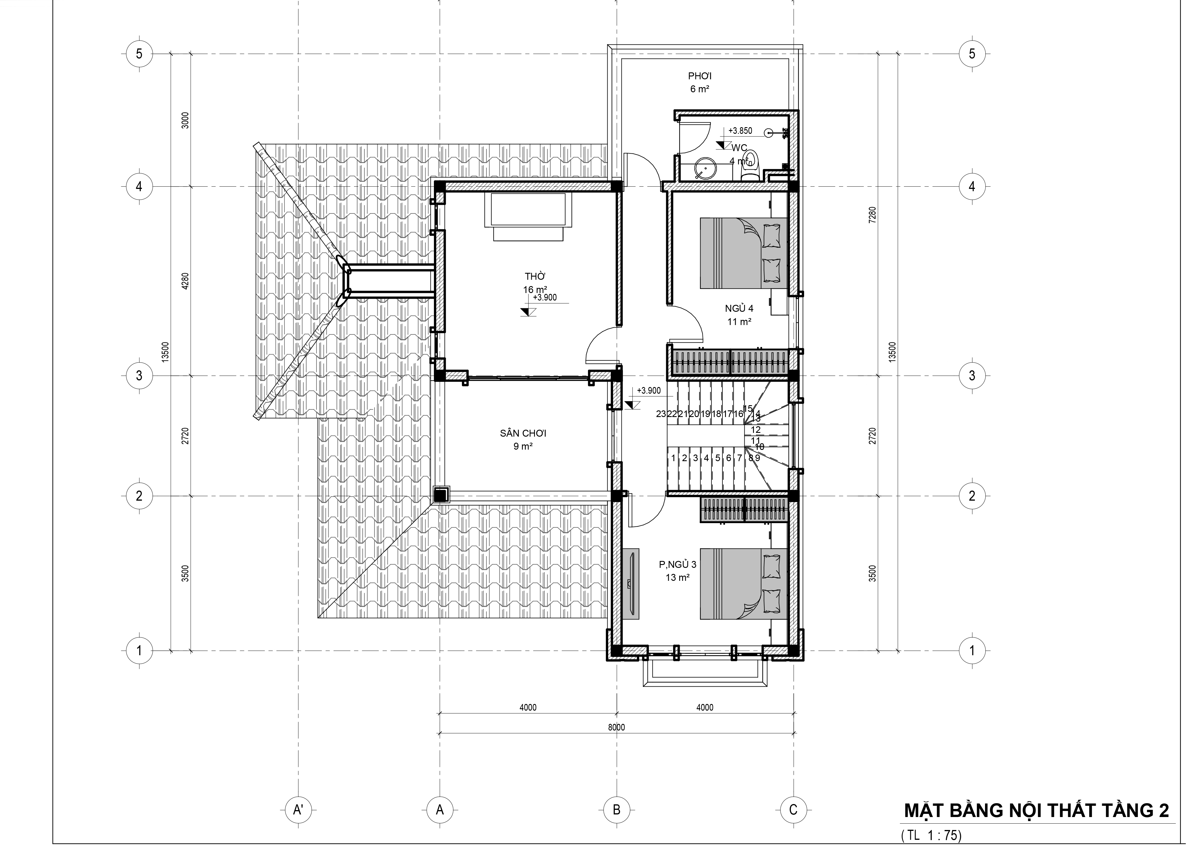 Tầng 2 được phân chia bố cục gồm 2 phòng ngủ với 1 phòng thờ. Ngoài ra còn có 1 sân phơi và 1 sân chơi ( 9m2).
