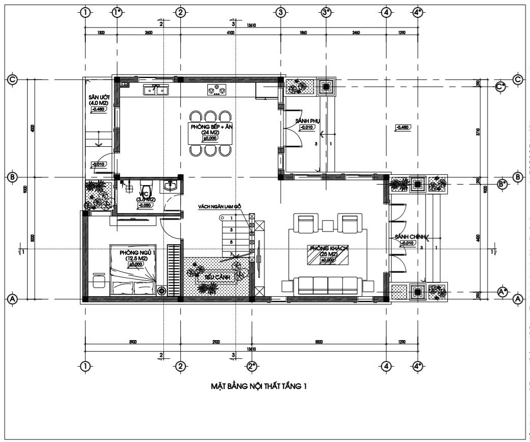 Bước từ ngoài vào trong là phòng khách thiết kế rộng rãi với diện tích 25m2. Không gian phòng khách được thiết kế tối giản, với 2 hệ cửa sổ lớn và 2 hệ cửa sổ nhỏ tạo sự thoải mái và thoáng đãng cho ngôi nhà. Đi sâu vào trong, phía bên phải là không gian phòng bếp (24m2) có sảnh riêng, tiện lợi cho việc chợ búa mà không cần phải đi qua phòng khách. Đồng thời từ phòng bếp sẽ có lối ra sân ướt (4m2) tiện cho việc chế biến thực phẩm phức tạp. Phía bên trái là 1 phòng ngủ (12,5 m2) và 1 wc chung cho cả tầng. Hệ thống cầu thang được bố trí tiểu cảnh tạo không gian xanh cũng như điểm nhấn cho ngôi nhà. Tại khu vực cầu thang sẽ được ngăn với không gian phòng khách bằng một hệ lam gỗ.