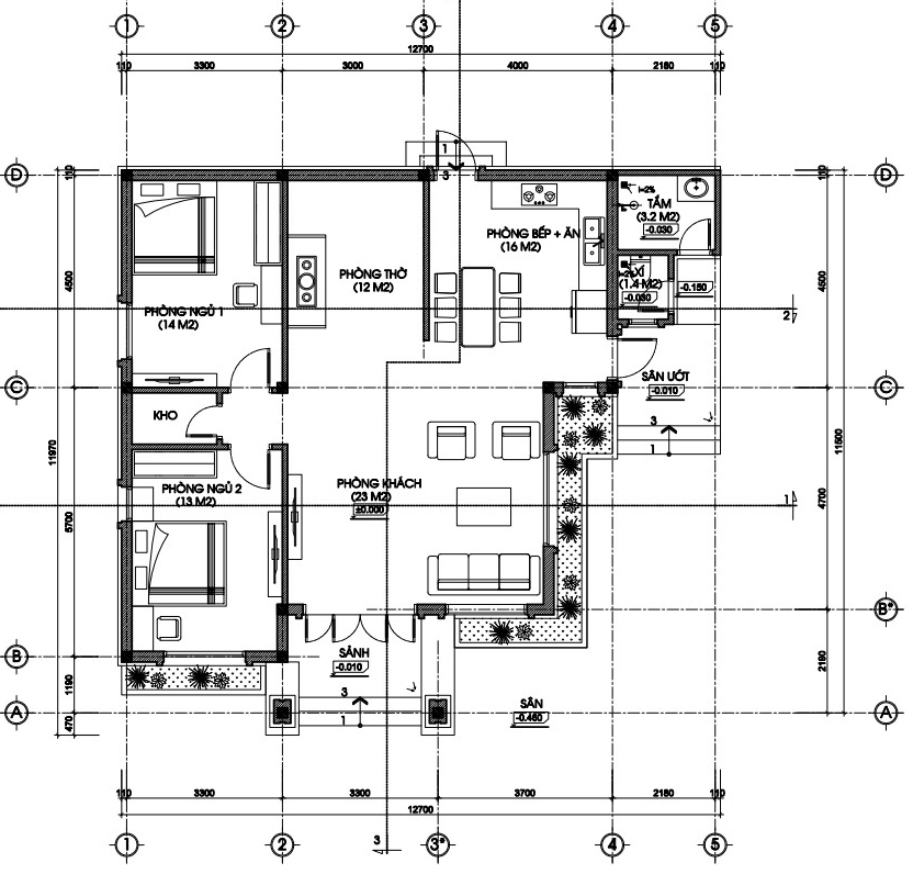 - Công năng dự kiến thi công là 2 phòng ngủ, 1 phòng thờ, 1 phòng khách, 1 phòng bếp, khu phụ đặt tách biệt.