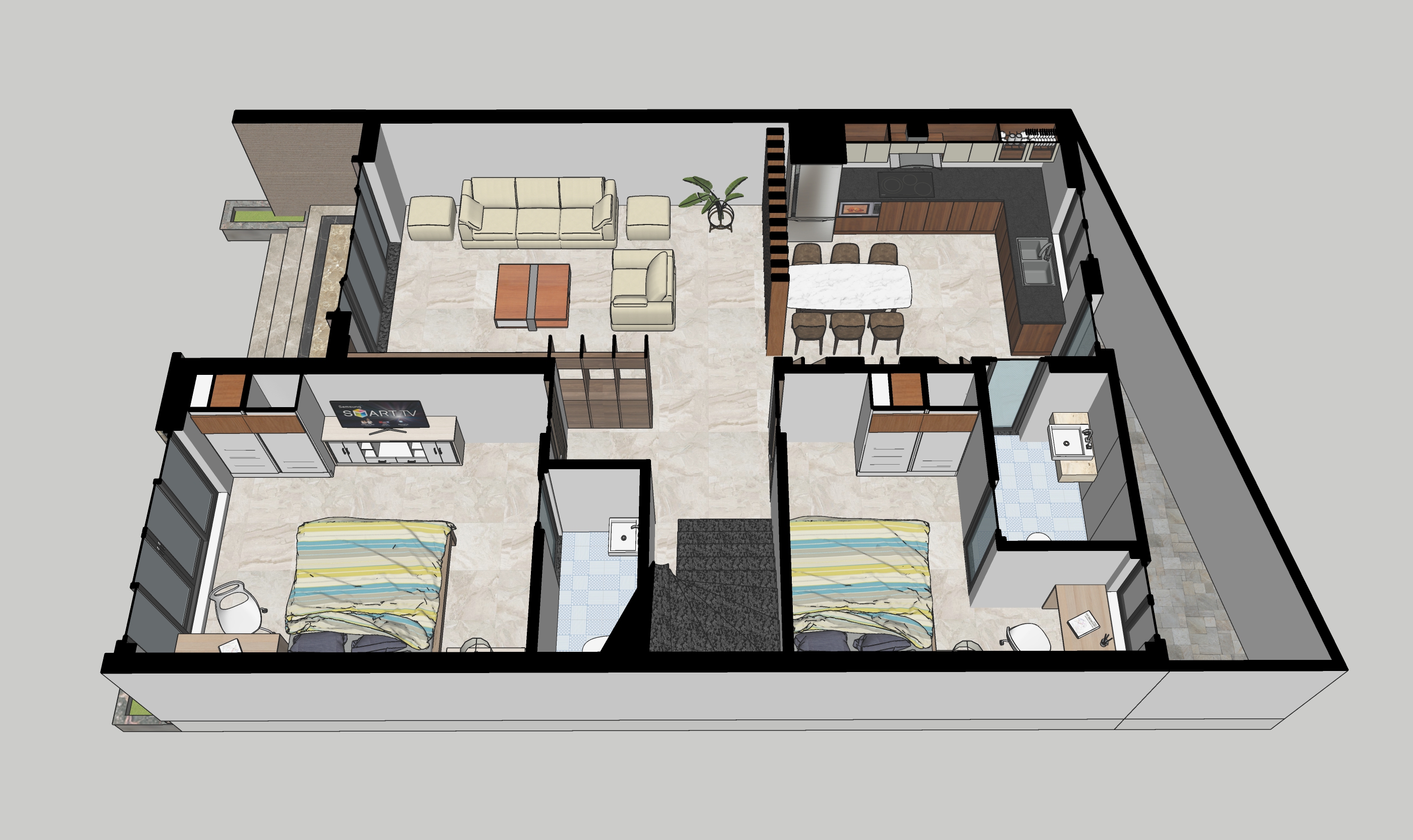 Phối cảnh bố trí công năng + nội thất nhà phố diện tích 8x11,5m