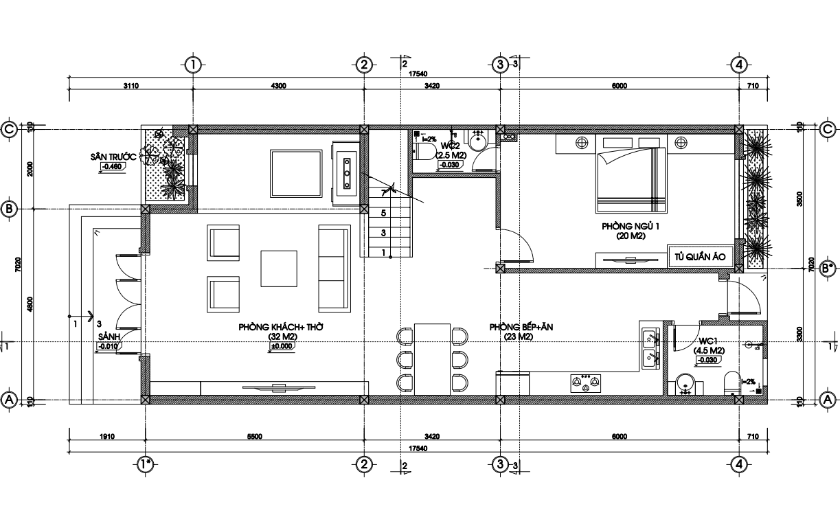 - Gia đình muốn thi công mẫu nhà lô phố với diện tích 7m x 17,5m.