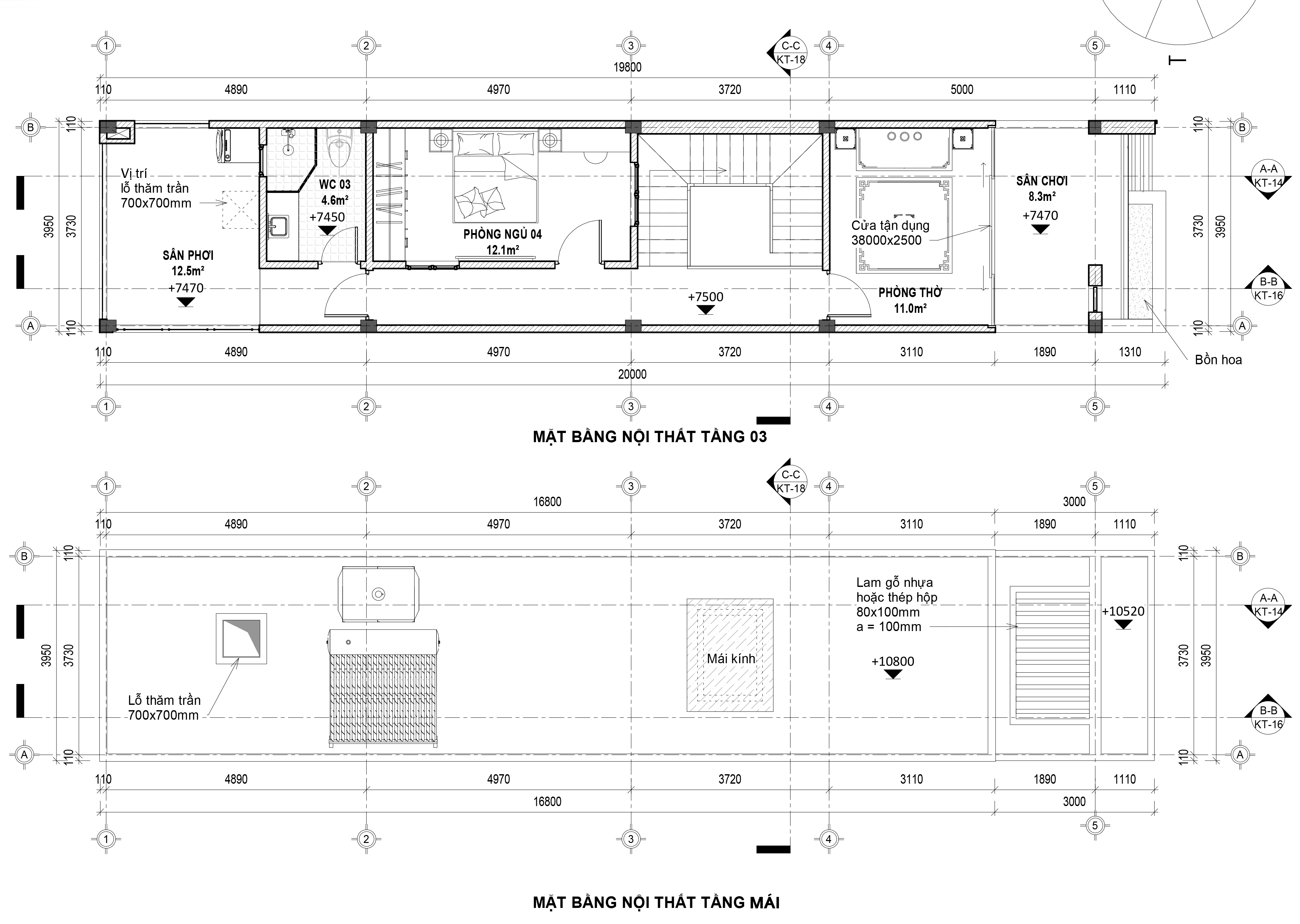 Mặt bằng nội thất tầng 3 + tầng mái