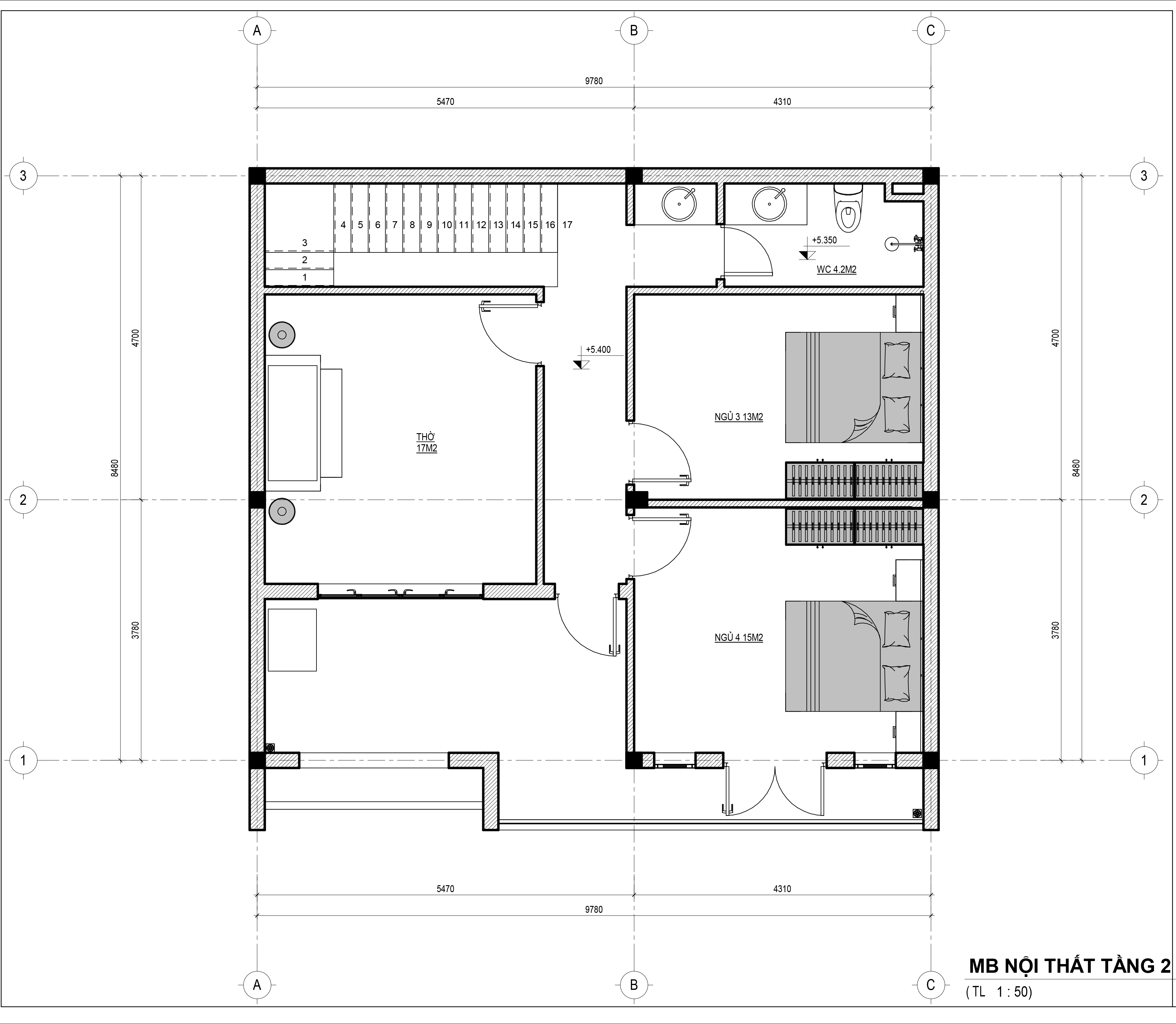 Mặt bằng tầng 2 nhà phố 8,5m x 9,7m