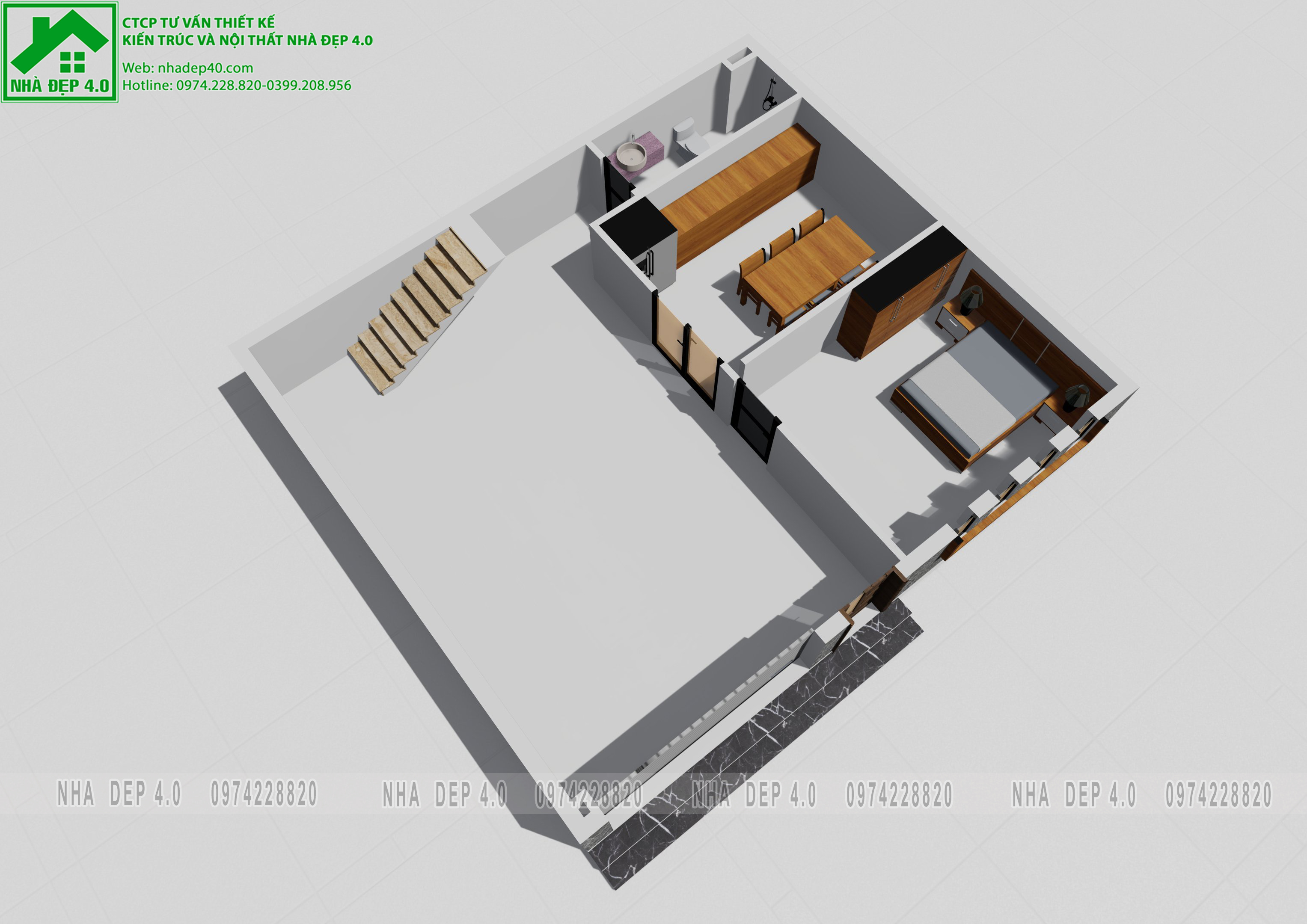 Mặt cắt nội thất 3D tầng 1 nhà phố 8,5m x 9,7m