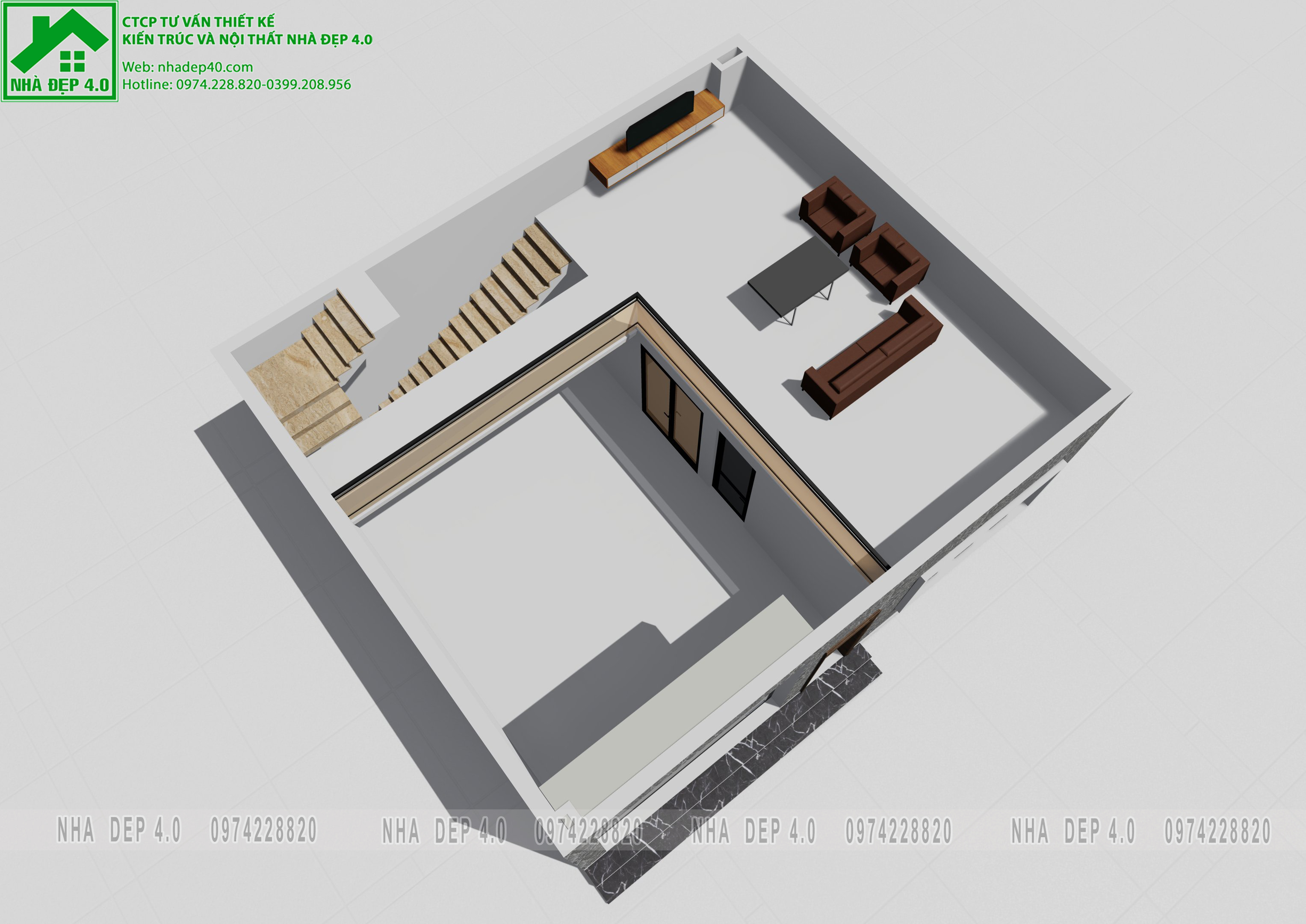 Mặt cắt nội thất 3D tầng lửng nhà phố 8,5m x 9,7m