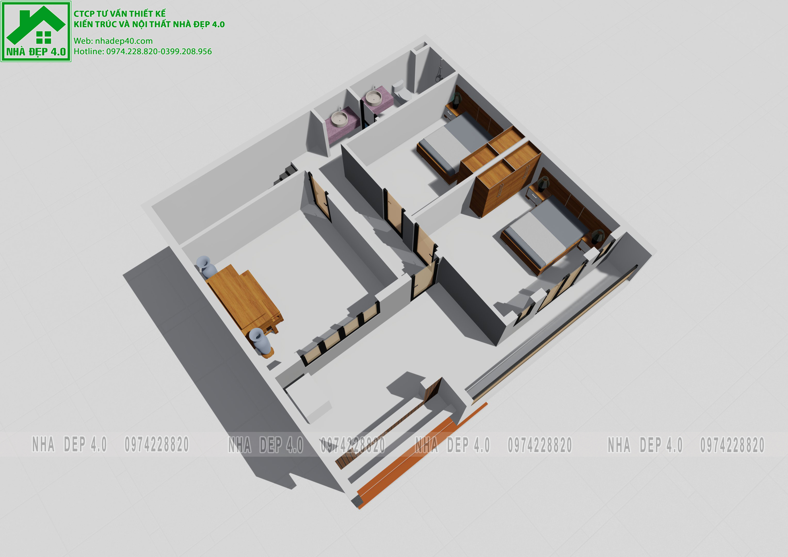 Mặt cắt nội thất 3D tầng 2 nhà phố 8,5m x 9,7m