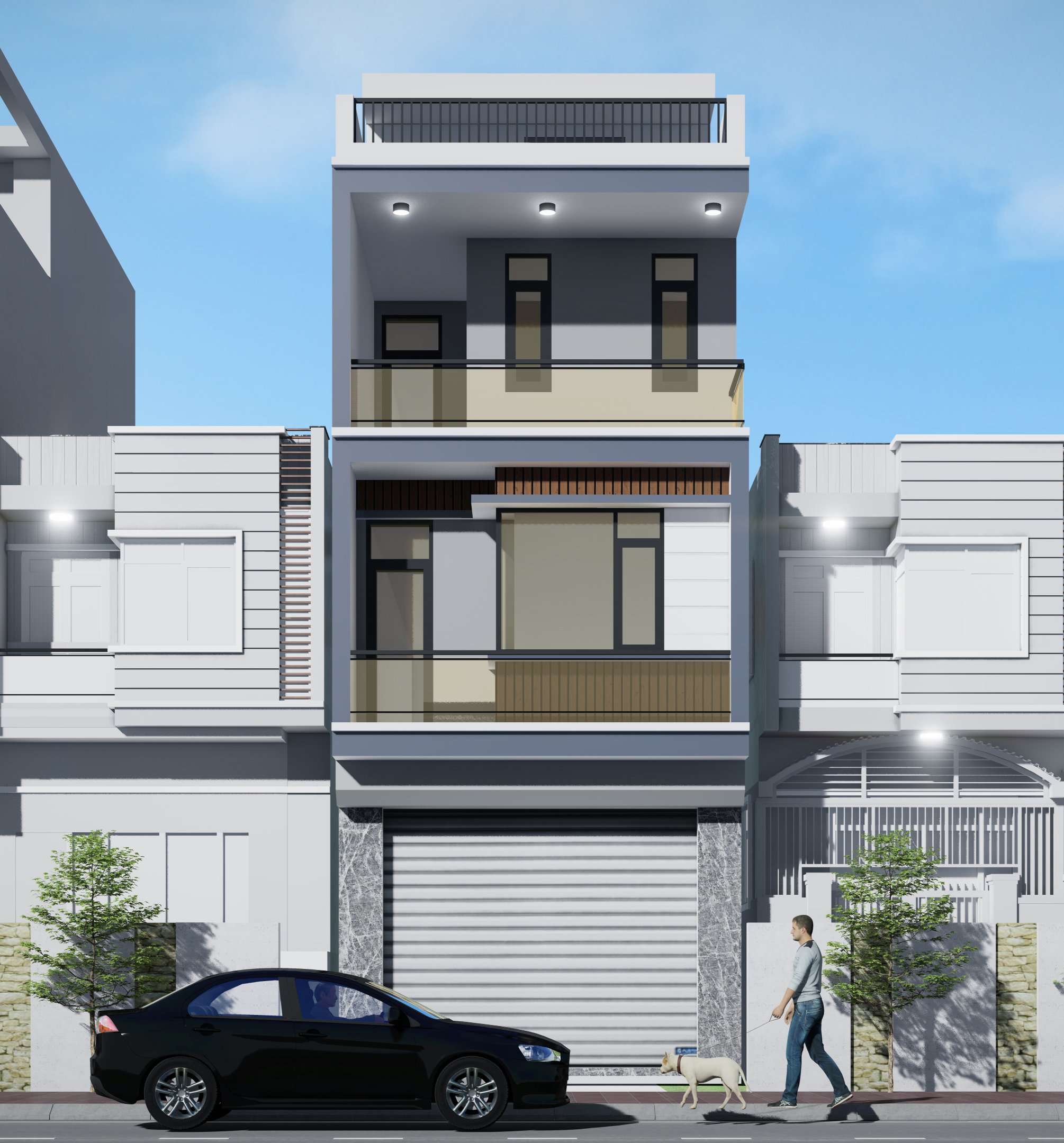 + Cùng với đó, để loại bỏ đi sự đơn điệu tại tầng 1 còn được ốp toàn bộ mặt tiền bằng đá granite vân mây màu xám tạo sự khác biệt, đồng thời giúp việc bảo quan bề mặt được tốt hơn, tránh sự xâm hại bởi các yếu tố tự nhiên như: nấm, bẩn…