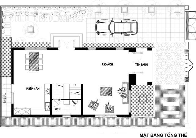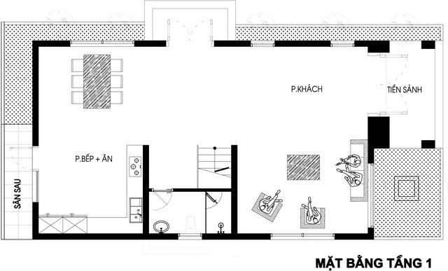 Từ tiền sảnh với bậc tam cấp thiết kế khá cao và thoáng, kiến trúc sư bố trí phòng khách ngay cạnh cửa chính, cầu thang thông tầng được bố trí ở giữa trung tâm, ngăn chia phòng khách với phòng bếp phía trong. Nhà vệ sinh chung được bố trí ngay cạnh cầu thang nhà vệ sinh tầng 1.