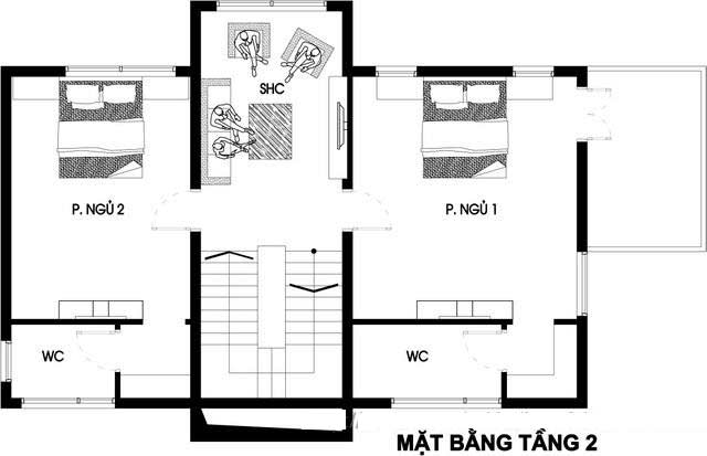 Tầng 2 mẫu nhà đẹp thiết kế 2 phòng ngủ, đối diện với nhau qua sảnh thông tầng, thiết kế có nhà vệ sinh khép kín. Không gian sảnh thang được tận dụng làm phòng sinh hoạt chung, thiết kế đơn giản với bộ bàn ghế sofa nhỏ.