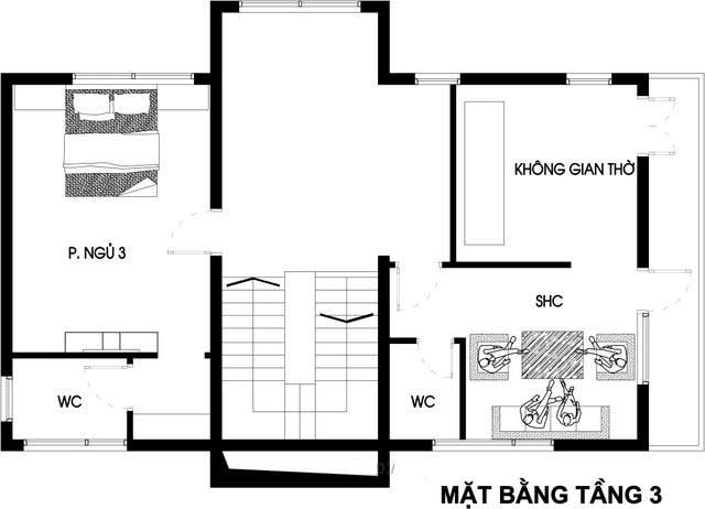 Tầng 3 thiết kế phòng thờ hướng ban công chính, một góc nhỏ được thiết kế liền kề, tận dụng là phòng sinh hoạt chung cho tầng 3, nhà vệ sinh chung được bố trí ngay cạnh phòng sinh hoạt chung. Phía bên kia bố trí 1 phòng ngủ, thiết kế khép kín.