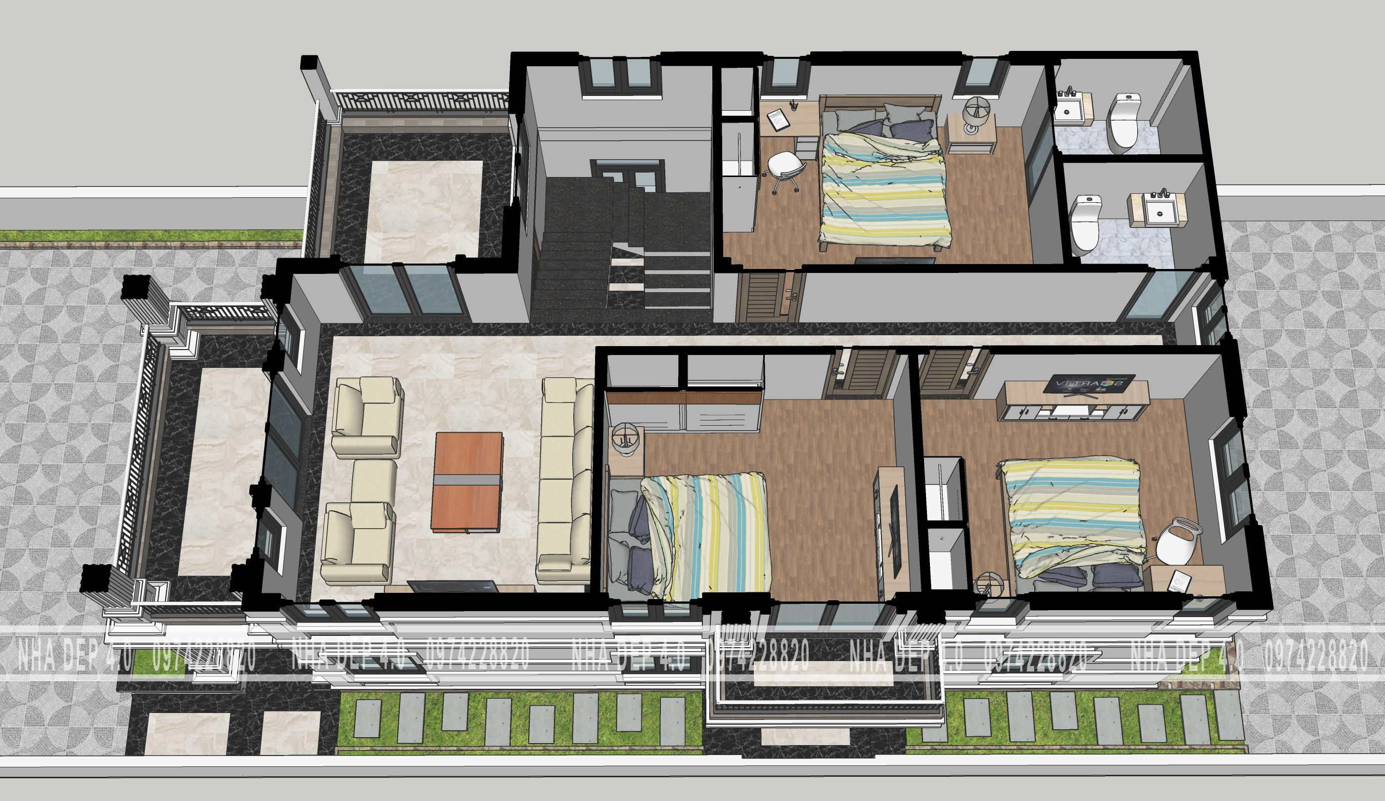 Phối cảnh bố trí công năng + nội thất biệt thự tầng 2