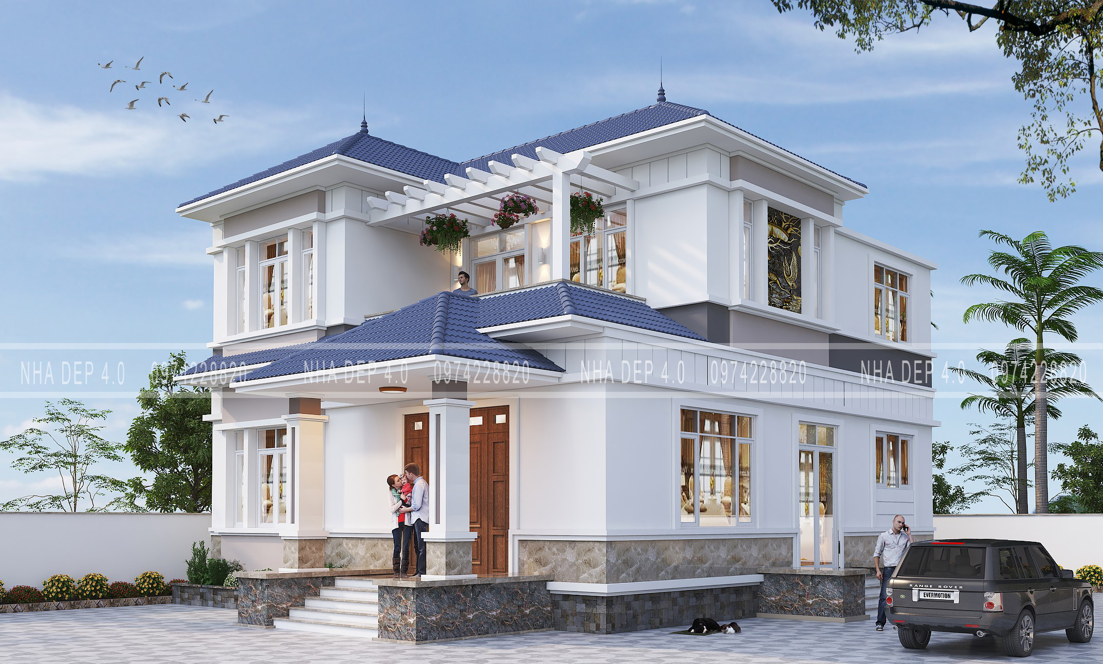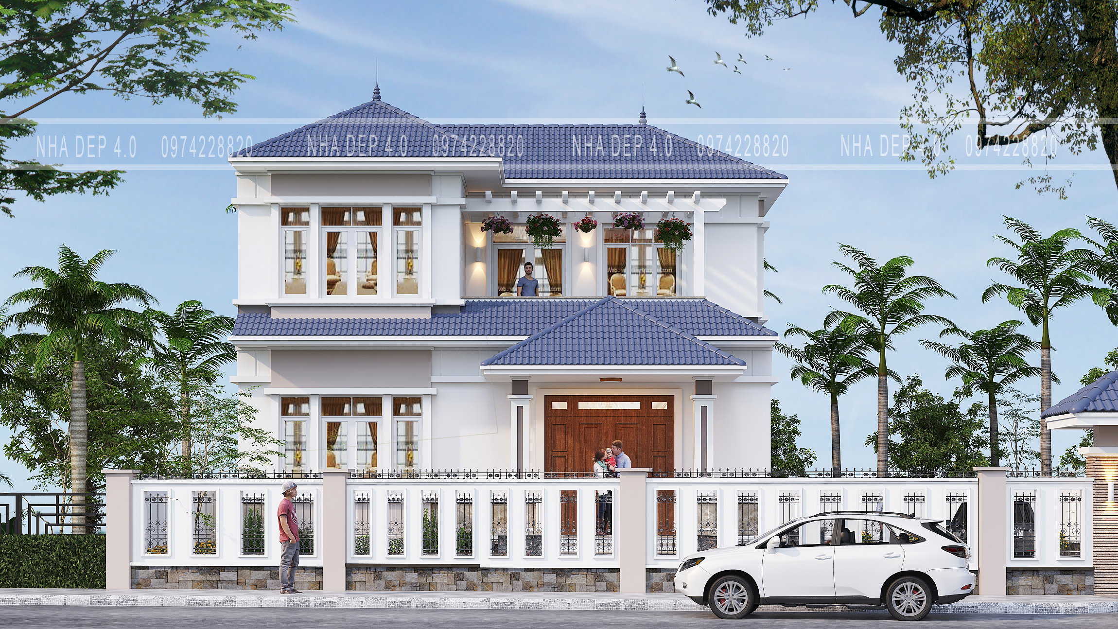 Mái ngói màu xanh dương kết hợp cùng tone màu trắng sứ nhẹ nhàng sẽ tạo nên sự liên kết nổi bật và hơi hướng hiện đại. Ngoài ra, ngôi nhà còn được sử dụng màu ghi tạo điểm nhấn trên các phần phân tầng, đầu cột. Thân nhà còn được bật lên bởi những gờ đắp nổi chạy xung quanh thân nhà và tạo điểm nhấn mạnh cho các hệ thống cửa sổ.