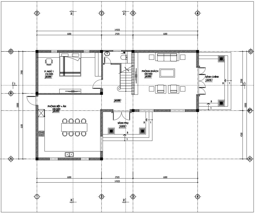 Bước từ ngoài vào trong, bên trái là phòng khách thiết kế rộng rãi với diện tích lên đến 32m2. Không gian phòng khách được thiết kế tối giản, với các hệ cửa sổ lớn nhỏ và bố trí 2 sảnh tạo sự thoải mái và thoáng đãng cho ngôi nhà.