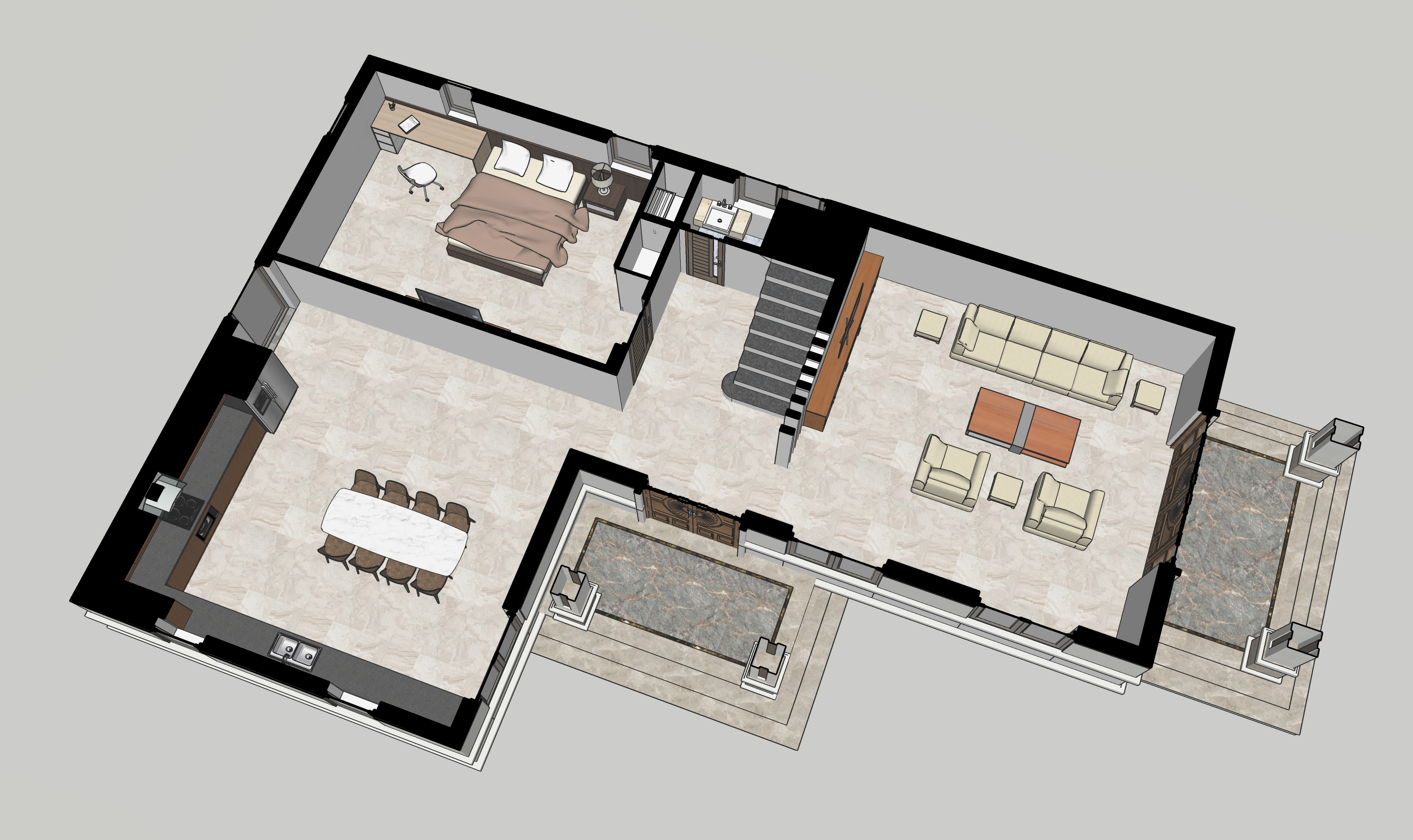 Phối cảnh bố trí công năng + nội thất biệt thự tầng 1