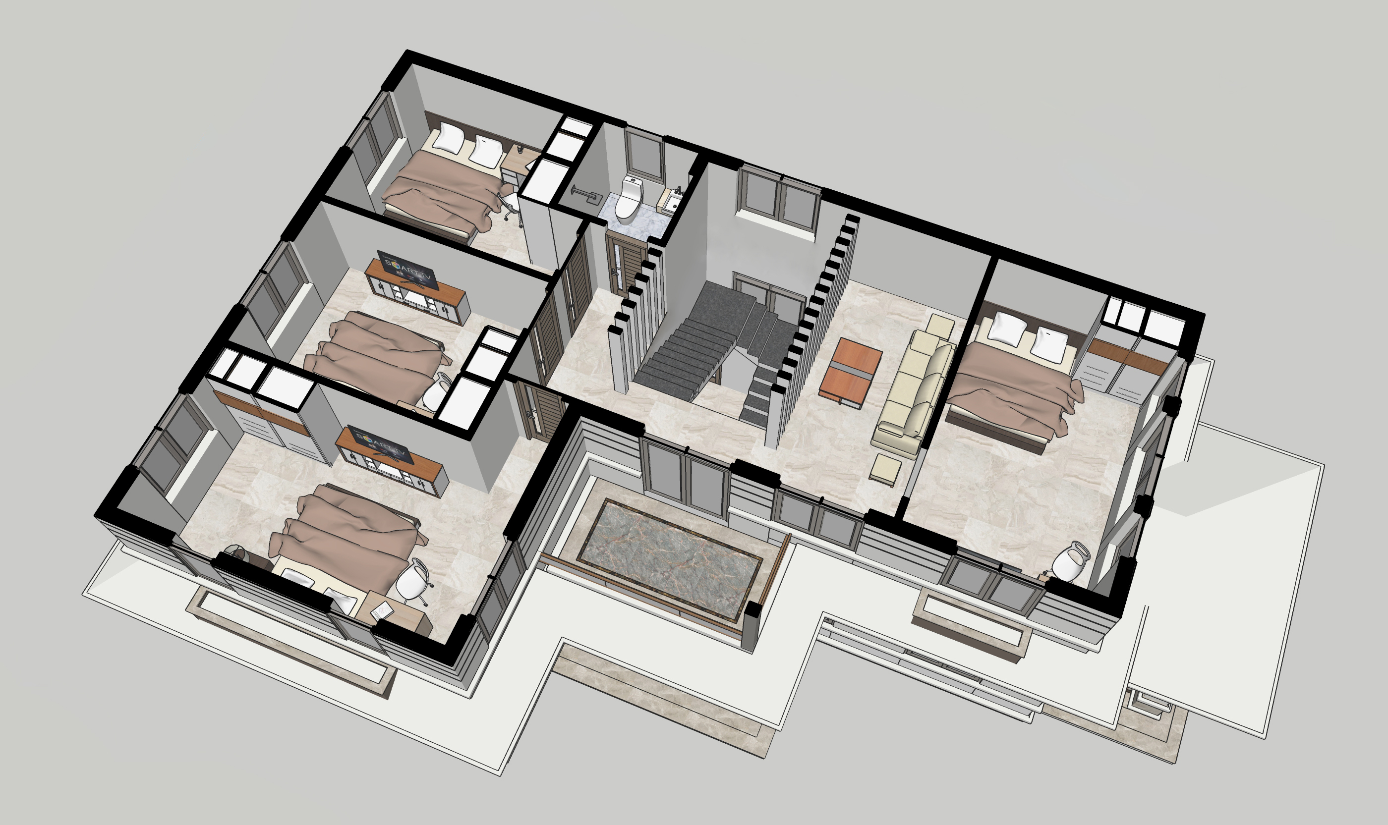 Phối cảnh bố trí công năng + nội thất biệt thự tầng 2