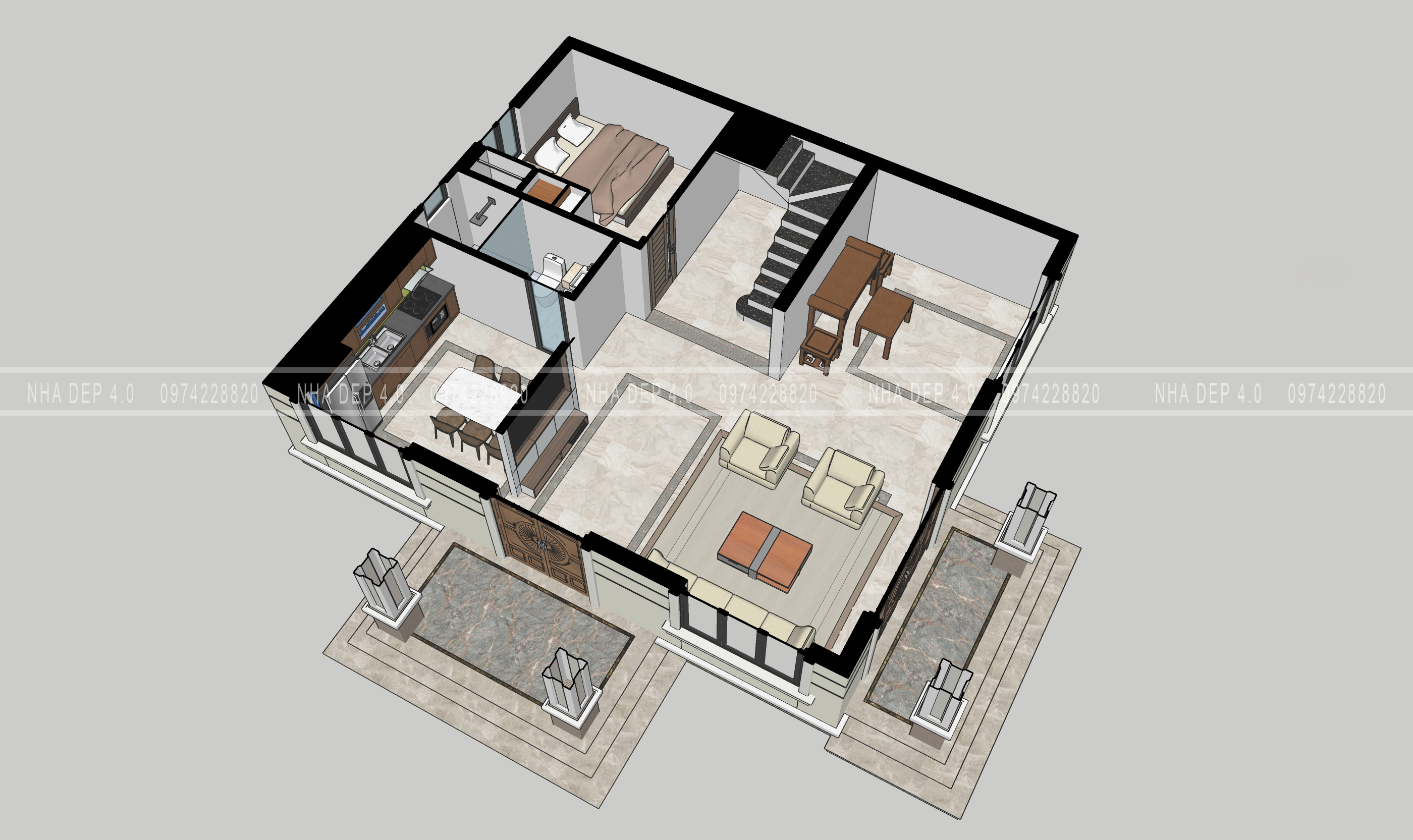 Phối cảnh bố trí công năng + nội thất biệt thự tầng 1