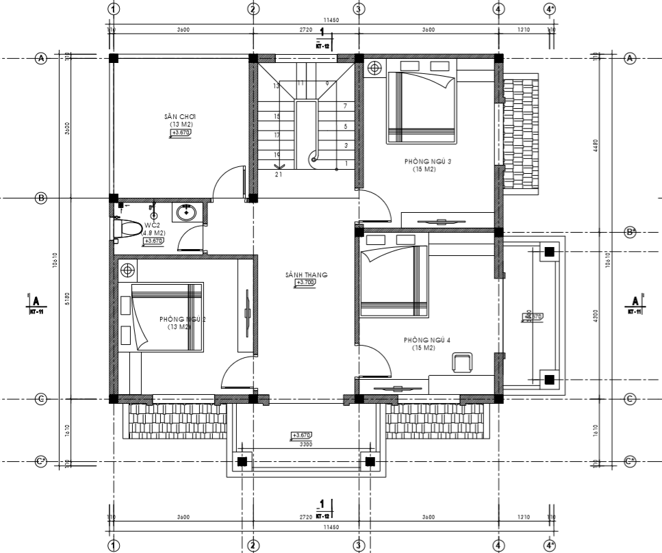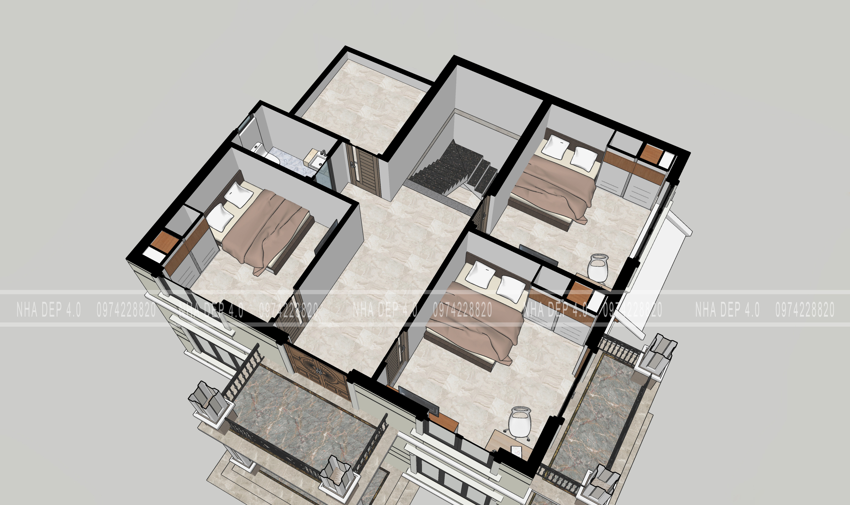Tầng 2 được phân chia bố cục tương tự, với 1 phòng ngủ phía bên trái (13m2) và 1 sân chơi gần 13m2 khá rộng. Bên phải có 2 phòng ngủ lớn hơn (15m2) với 1 phòng ngủ có ban công riêng. Và cuối cùng là 1 ban công chung vô cùng thông thoáng, đáp ứng đúng nhu cầu của chú Năng.
