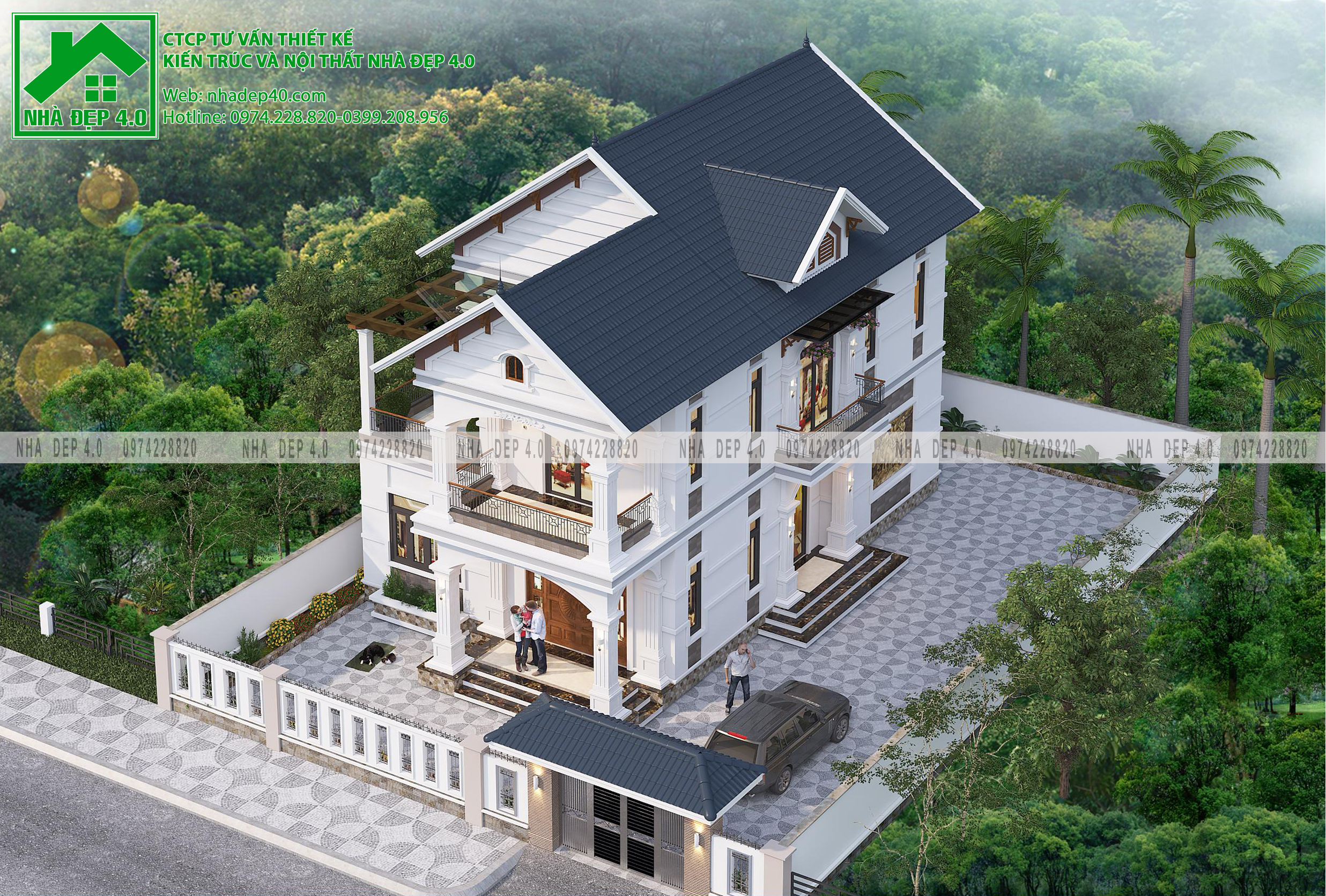 Mái ngói màu xanh than kết hợp cùng tone màu trắng sứ nhẹ nhàng sẽ tạo nên sự liên kết nổi bật và hơi hướng hiện đại. Ngoài ra, ngôi nhà còn được sử dụng màu xanh ghi tạo điểm nhấn trên các phần phân tầng, tạo điểm nhấn nhẹ nhàng cho công trình. Thân nhà và viền cửa sổ còn được bật lên bởi những gờ đắp nổi chạy xung quanh tạo điểm nhấn mạnh cho công trình của nhà anh Hà. Những đường chỉ lõm trên cột, cùng với hoa văn trên các hệ vòm trước sảnh đã thổi được hơi hướng tân cổ vào công trình như mong muốn của anh Hà, anh hoàn toàn rất ưng ý.