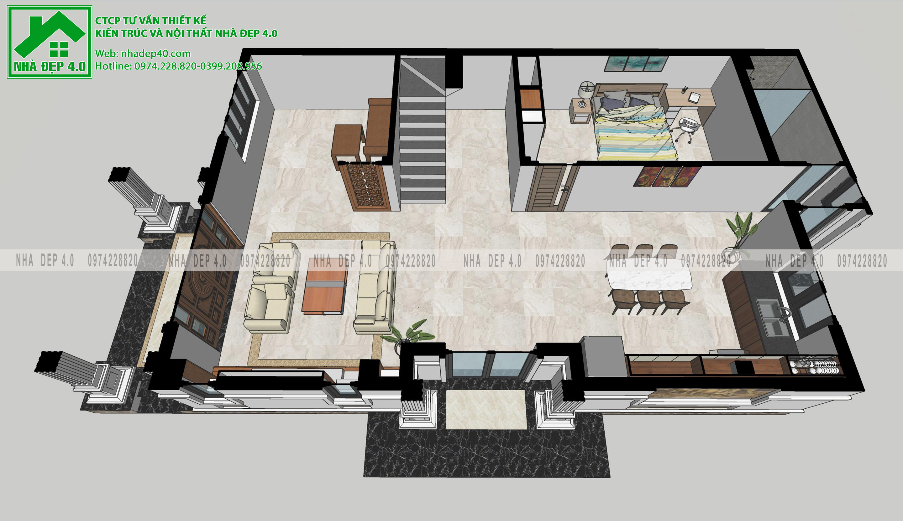 Phối cảnh bố trí công năng + nội thất biệt thự tầng 1