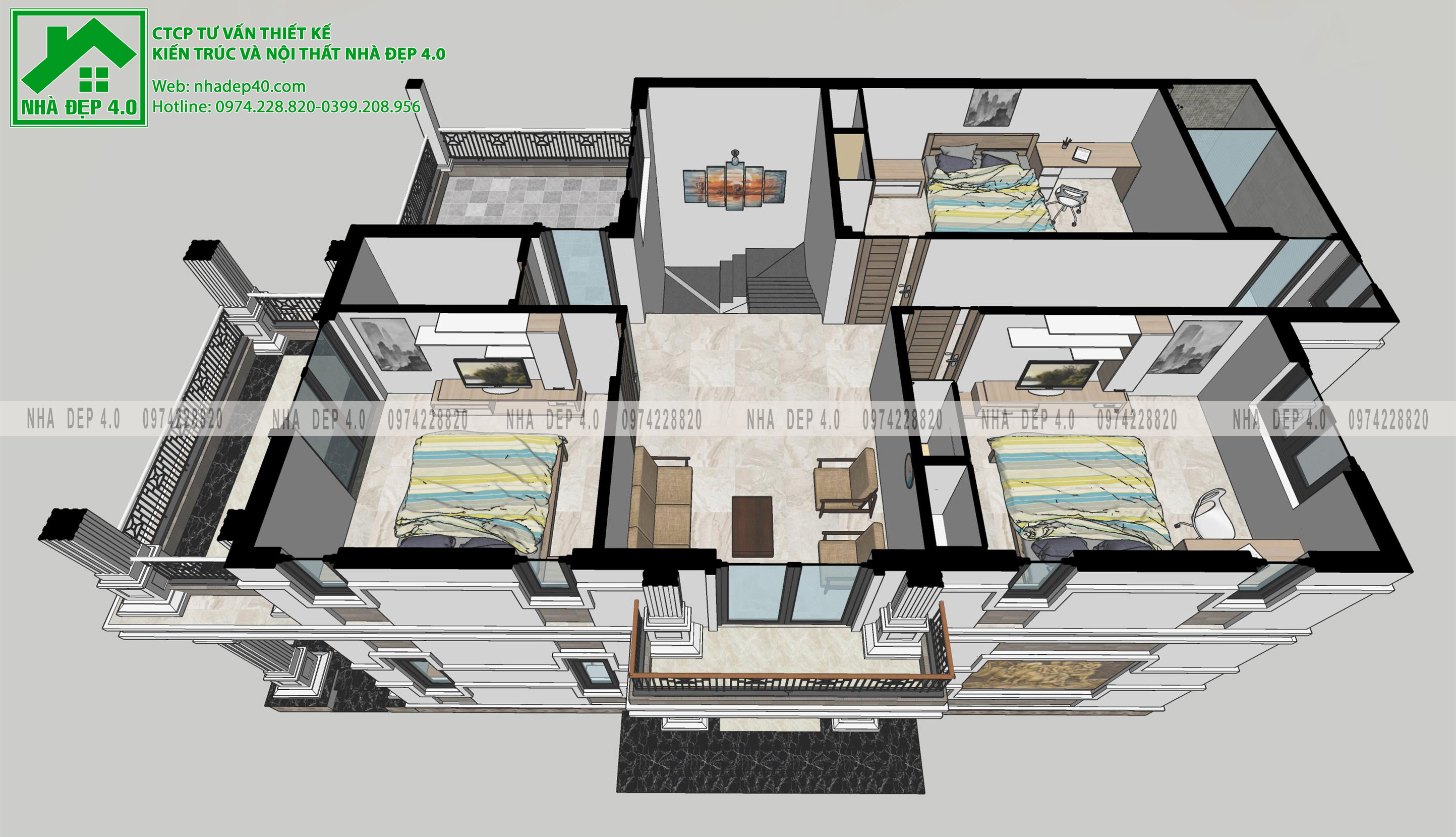 Phối cảnh bố trí công năng + nội thất biệt thự tầng 2