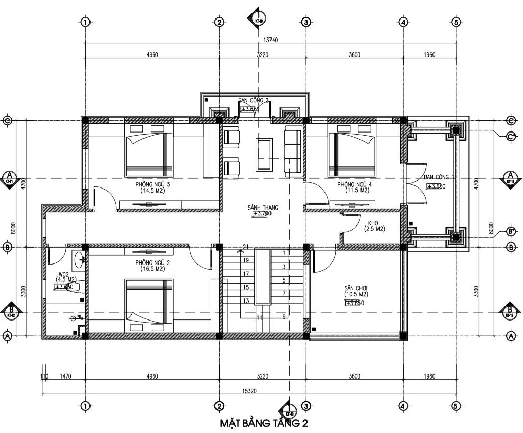 Tầng 2 được phân chia với bên trái cầu thang là 2 phòng ngủ lớn 14,5m2 & 16m2 và phía bên phải là 1 phòng ngủ nhỏ (11,5 m2) và 1 sân chơi. Sân chơi (10m2) được bố trí giàn hoa hệ lam gỗ, tăng thêm sự tinh tế và hiện đại cho công trình.