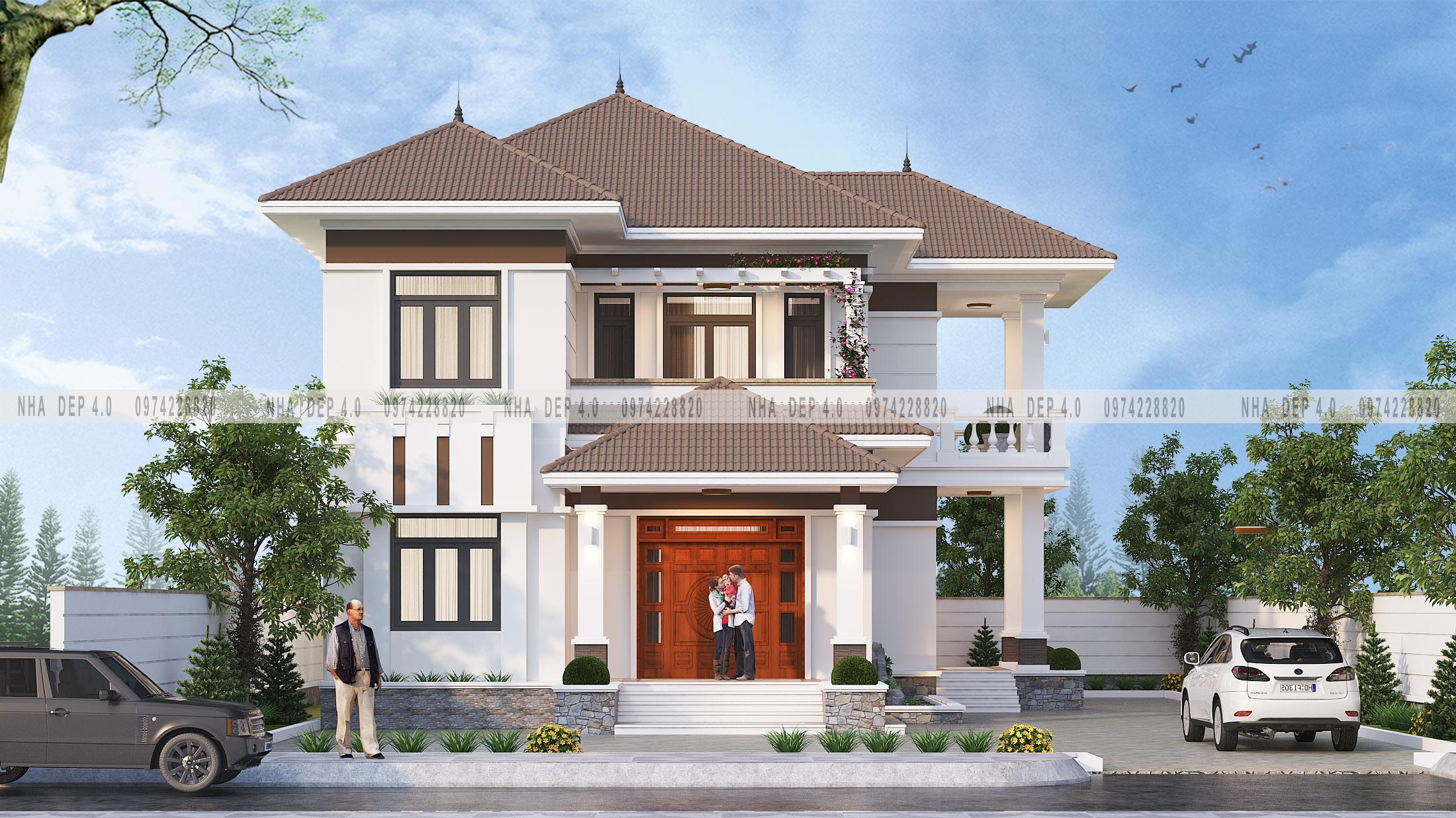 Mái ngói màu nâu kết hợp cùng tone màu trắng sứ nhẹ nhàng sẽ tạo nên sự liên kết nổi bật và hơi hướng hiện đại. Ngoài ra, ngôi nhà còn được sử dụng màu cà phê tạo điểm nhấn trên các phần phân tầng, đầu và chân cột. Thân nhà còn được bật lên bởi những gờ đắp nổi chạy xung quanh và các đường kẻ chỉ trên thân nhà và tạo điểm nhấn mạnh cho các hệ thống cửa sổ.