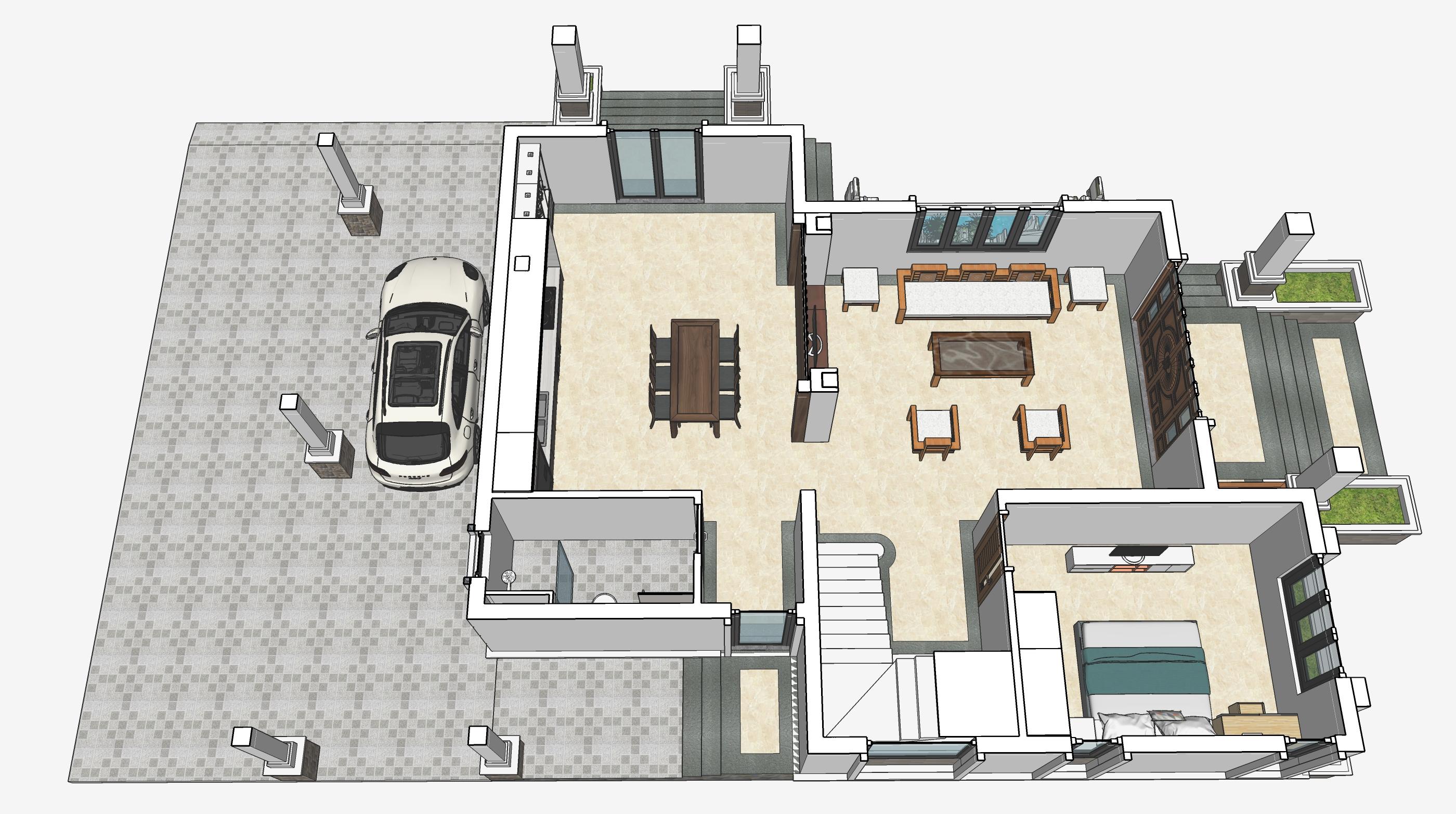 Phối cảnh bố trí công năng + nội thất biệt thự tầng 1