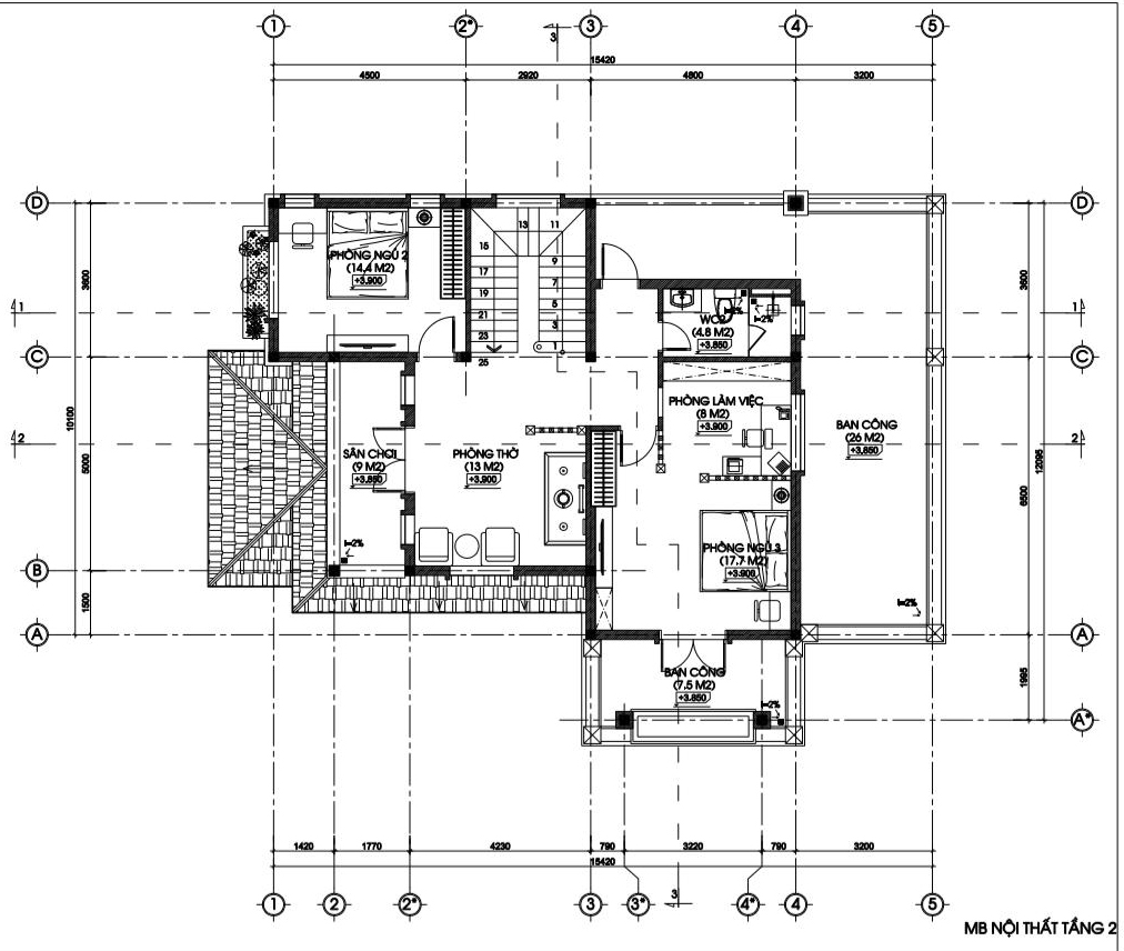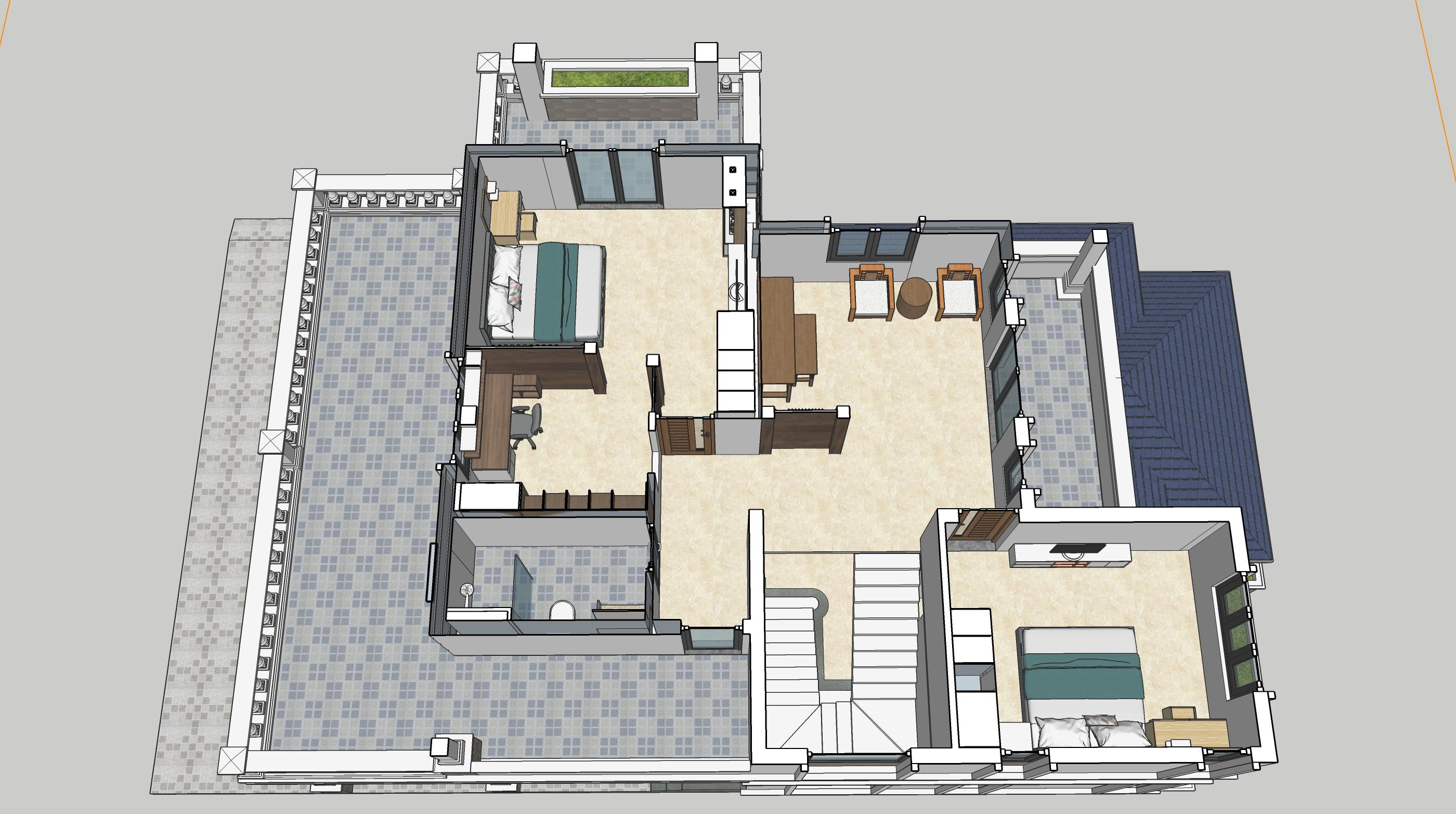 Tầng 2 được phân chia bố cục tương tự, với 1 phòng thờ (13m2) và 2 phòng ngủ còn lại. Phòng ngủ thứ nhất trên tầng 2 có diện tích tương tự phòng ngủ bên dưới. Phòng ngủ cuối cùng là phòng master được bố trí riêng phòng làm việc rộng rãi. Và cuối cùng là 1 ban công – sân chơi bên ngoài, đáp ứng đúng nhu cầu của chú Phụ. Sân chơi được bố trí hệ lam làm dàn hoa càng tăng thêm độ gần gũi với thiên nhiên cho công trình.