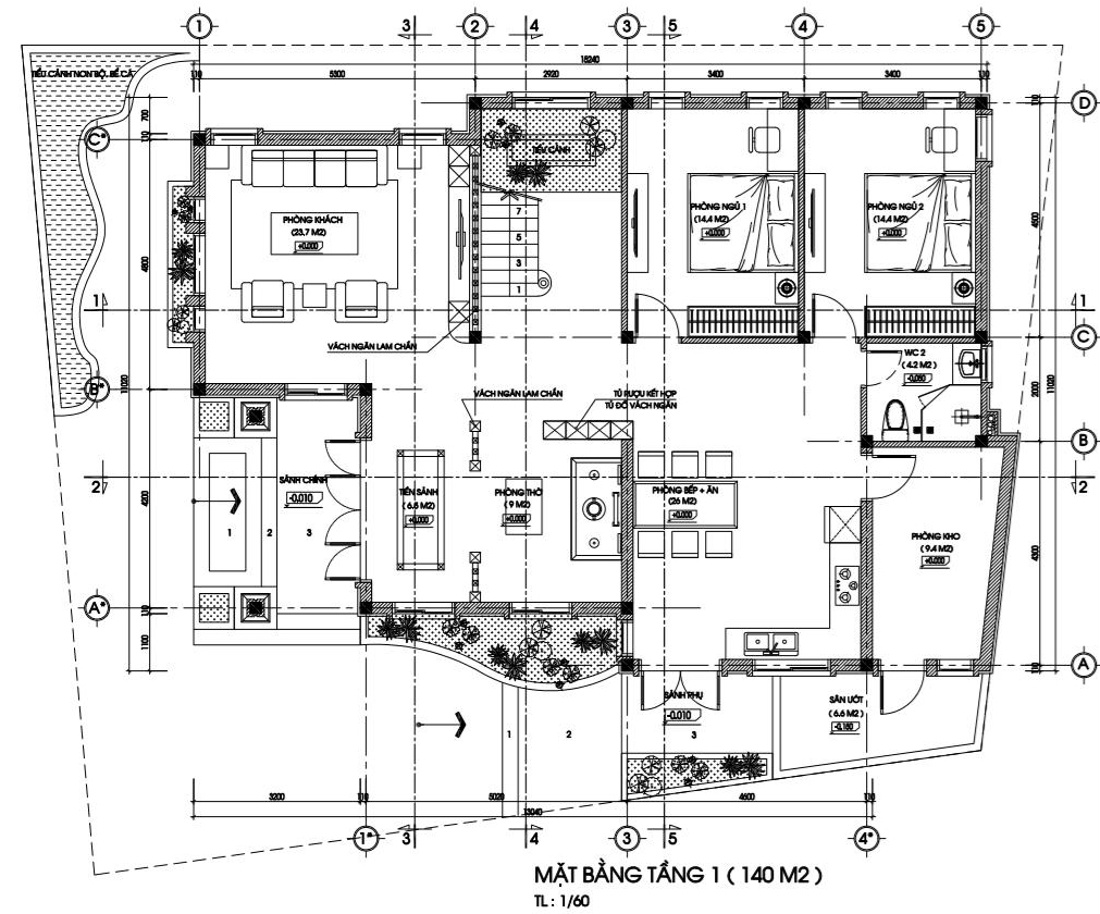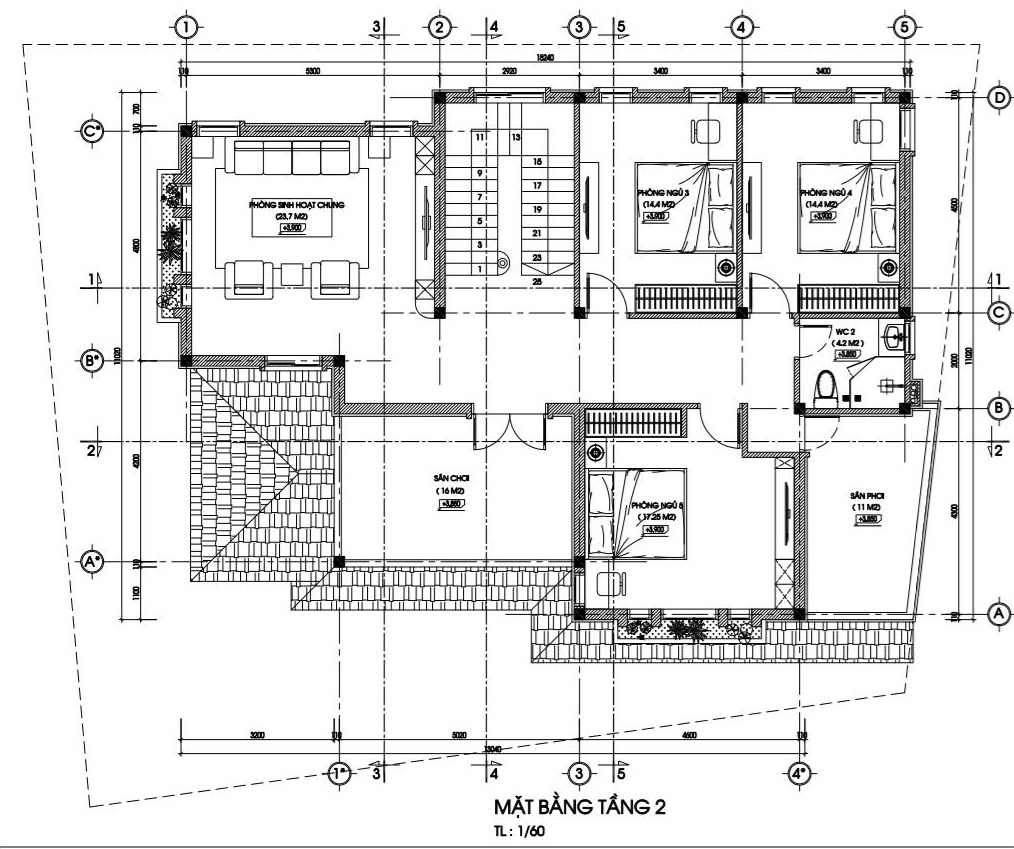 - Công năng dự kiến thi công là 5 phòng ngủ, 1 phòng khách, 1 phòng thờ, 1 phòng sinh hoạt chung, 1 phòng bếp, đặc biệt có thêm sân chơi cho cả nhà.