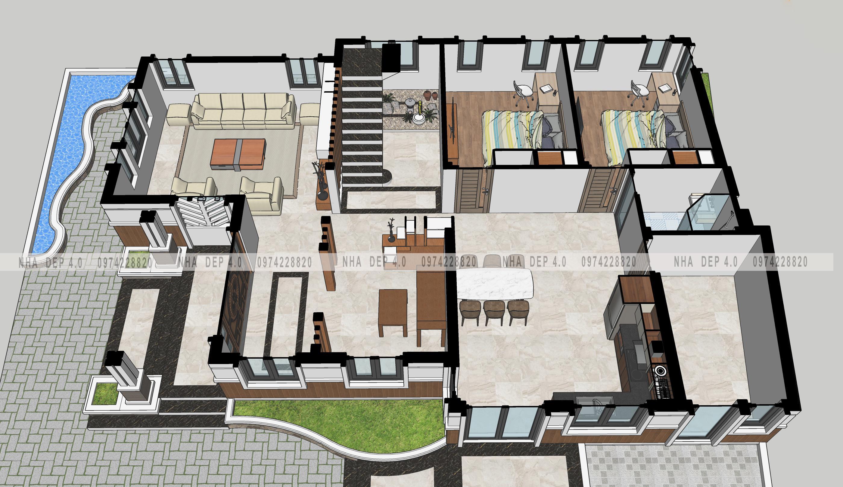 Phối cảnh bố trí công năng + nội thất biệt thự tầng 2