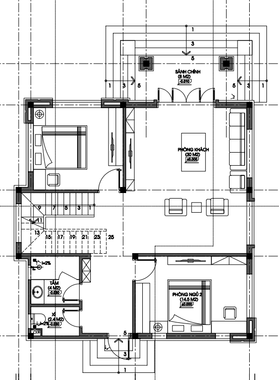 Cùng với bố cục vuông vắn là hệ ngũ cấp càng tôn lên sự bề thế cho công trình, thước cột trước sảnh được sử dụng kích thước lớn 600x600. Cả 2 sảnh đều được mở rộng để chào đón khách khứa đến chơi nhà có cảm giác thoải mái dễ chịu nhất.