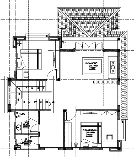 Tầng 2 được phân chia bố cục tương tự. Với 2 phòng ngủ kích thước và bố trí tương đương ở tầng 1. Một phòng thờ nho nhỏ diện tích 11,3m2 được đặt hướng hợp mênh gia chủ. Và trên tầng 2 có một ban công rộng rãi, mở rộng diện tích lấy sáng tối ưu cho không gian tầng 2.