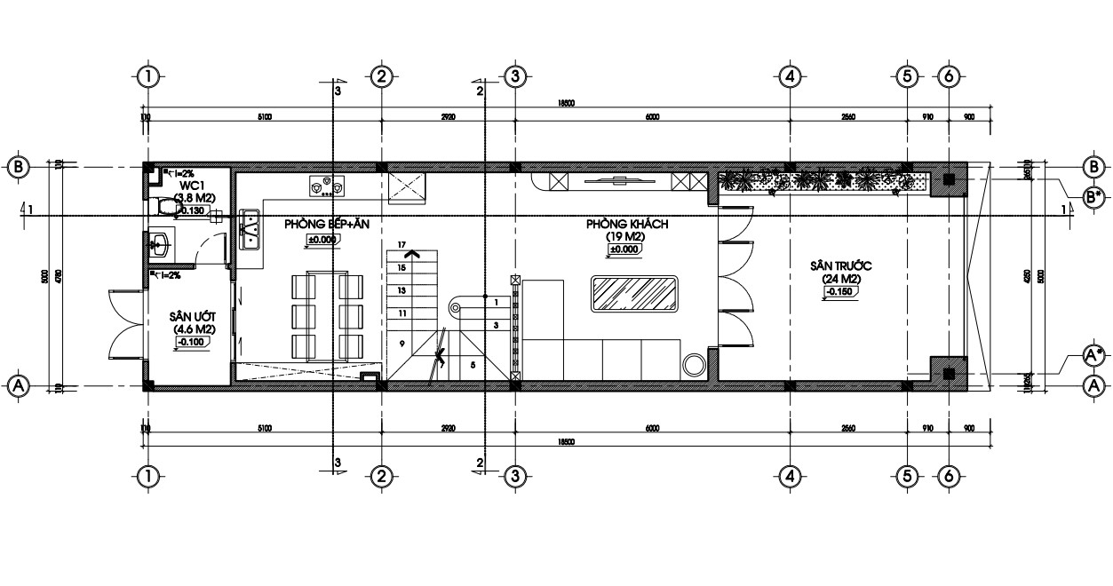 Mặt bằng tầng 1 nhà phố 5x18,5m