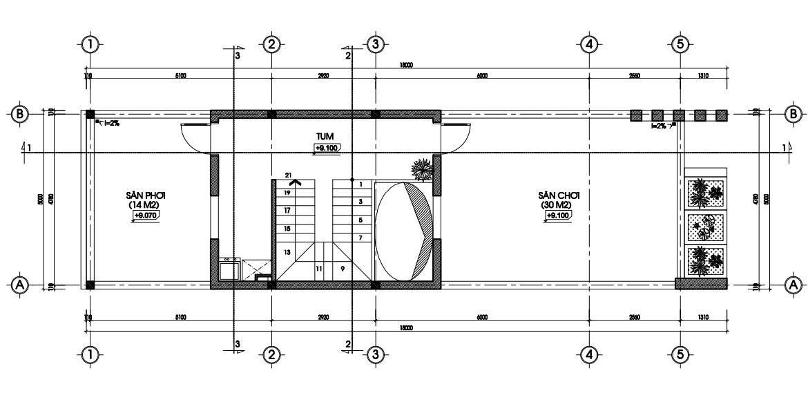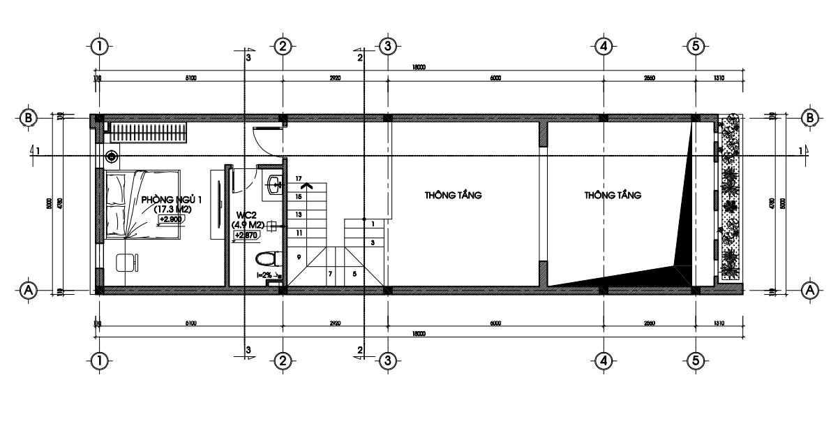 Mặt bằng tầng 2 nhà phố 5x18,5m
