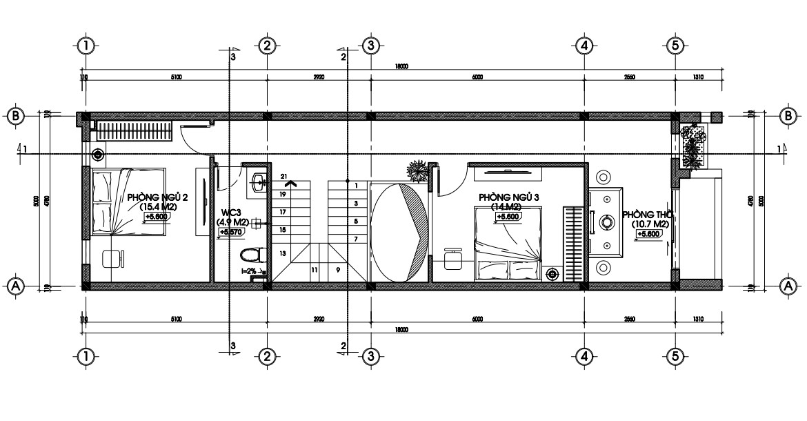 Mặt bằng tầng 3 nhà phố 5x18,5m