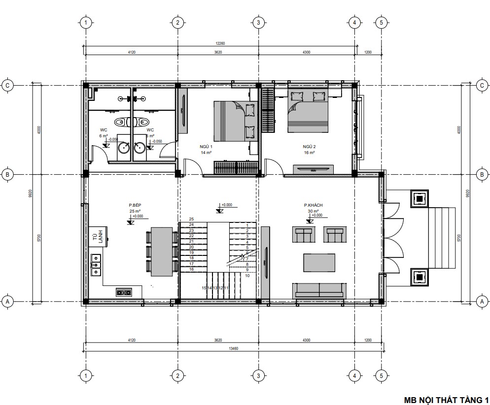 Bước từ ngoài vào là không gian phòng khách thiết kế rộng rãi với diện tích 30m2. Không gian phòng khách được thiết kế tối giản với các hệ cửa sổ tạo sự thoải mái và thoáng đãng cho ngôi nhà. Vào sâu thêm là khu vực cầu thang tiếp đến là bếp ăn (25m2), đối diện cầu thang là 2 phòng ngủ. 1 phòng ngủ lớn rộng 20m2 ( có WC riêng) và phòng ngủ nhỏ rộng 16m2 cùng 1 wc chung cho toàn tầng 1.
