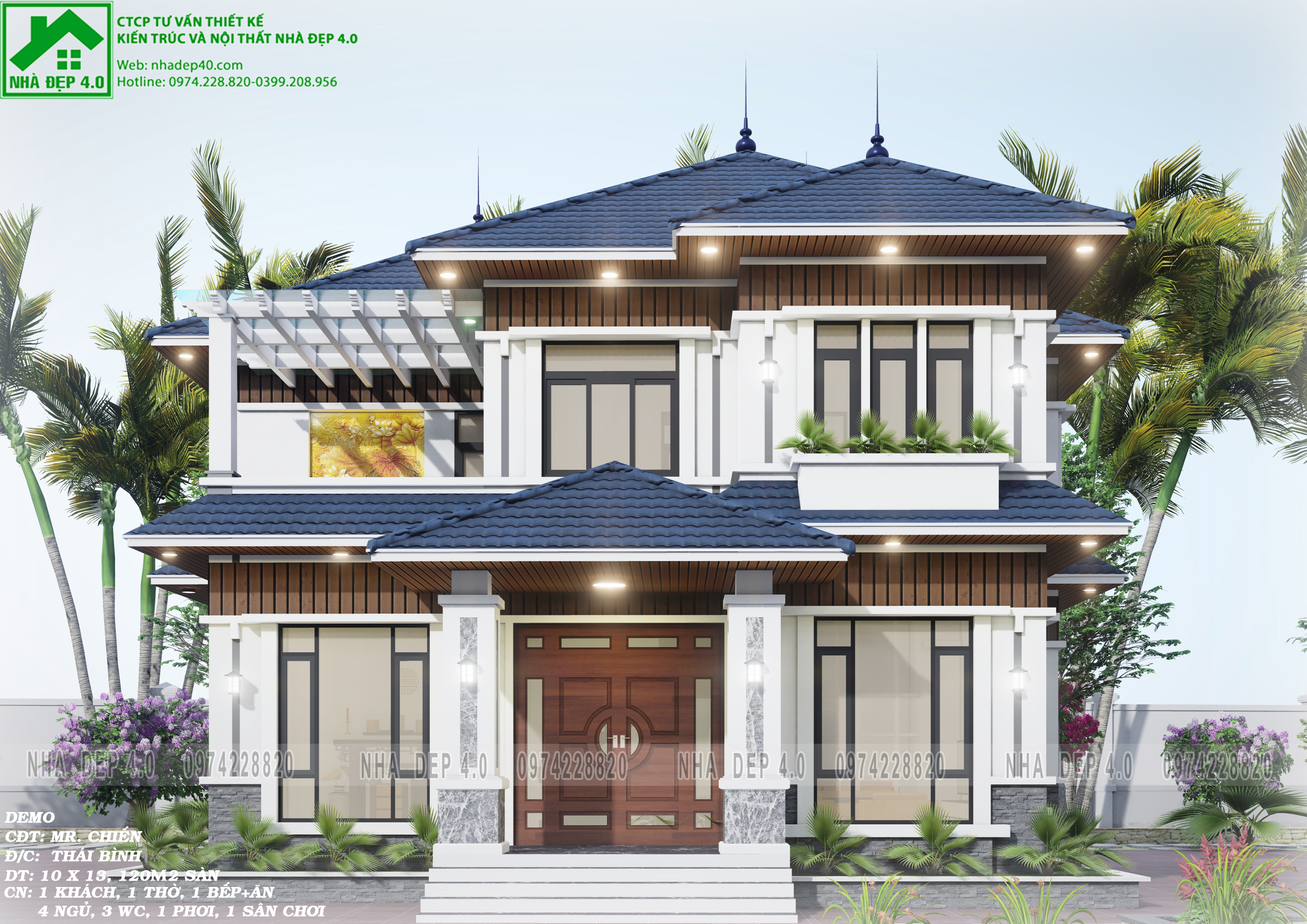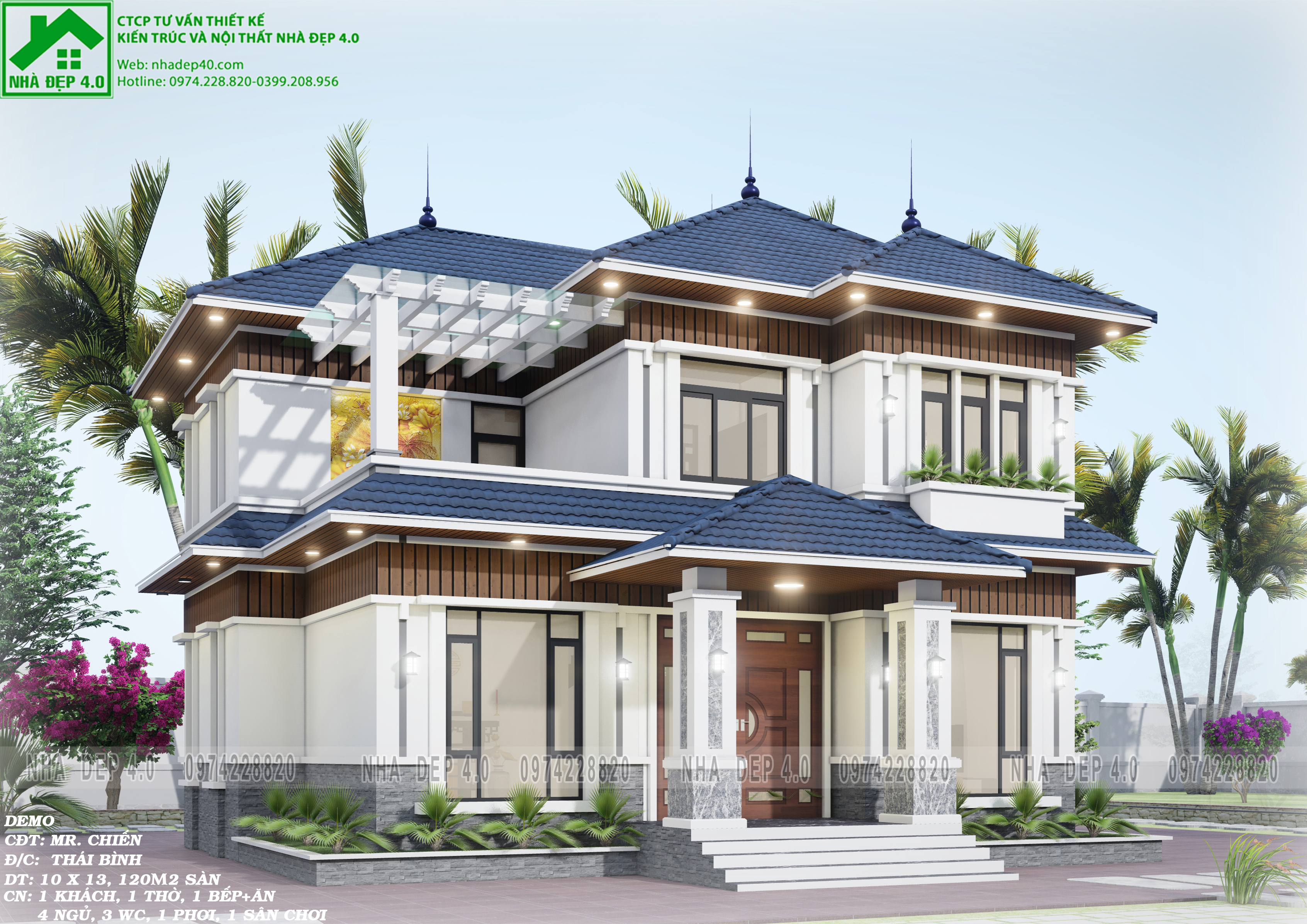 Ấn tượng đầu tiên khi bạn nhìn thấy Thiết kế biệt thự 2 tầng mái Nhật hiện đại là một không gian sống rất sang trọng và yên bình. Ngắm nhìn một cách tổng thể biệt thự vườn 2 tầng hiện đại sau đây chắc chắn bạn sẽ cảm thấy thư thái, nhẹ nhõm sau một ngày dài bon chen với cuộc sống xô bồ bên ngoài. Mẫu biệt thự 2 tầng kích thước 10x13m tràn ngập sức sống hiện đại được Nhà Đẹp 4.0 thiết kế cho gia đình anh Chiến tại Thái Bình. Với mặt tiền ấn tượng cùng với công năng sử dụng khoa học, hy vọng sẽ giúp các bạn có thể tham khảo để có thêm những ý tưởng thiết kế hoàn hảo cho gia đình mình nhé.