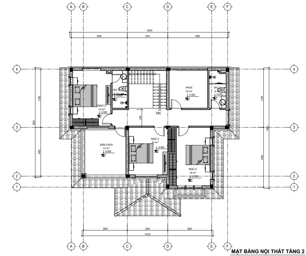 Tầng 2 được phân chia bố gồm 3 phòng ngủ, 1 sân phơi, 1 sân chơi và 1 WC chung cho toàn tầng. Trong đó có 1 phòng ngủ lớn kích thước 14m2 có WC khép kín, 2 phòng ngủ nhỏ có diện tích lần lượt là 14m2 và 15m2. Tầng 2 có 1 ban công rộng thoáng được bố trí hệ giàn hoa tạo điểm nhấn cho ngôi nhà nhà anh Chiến.
