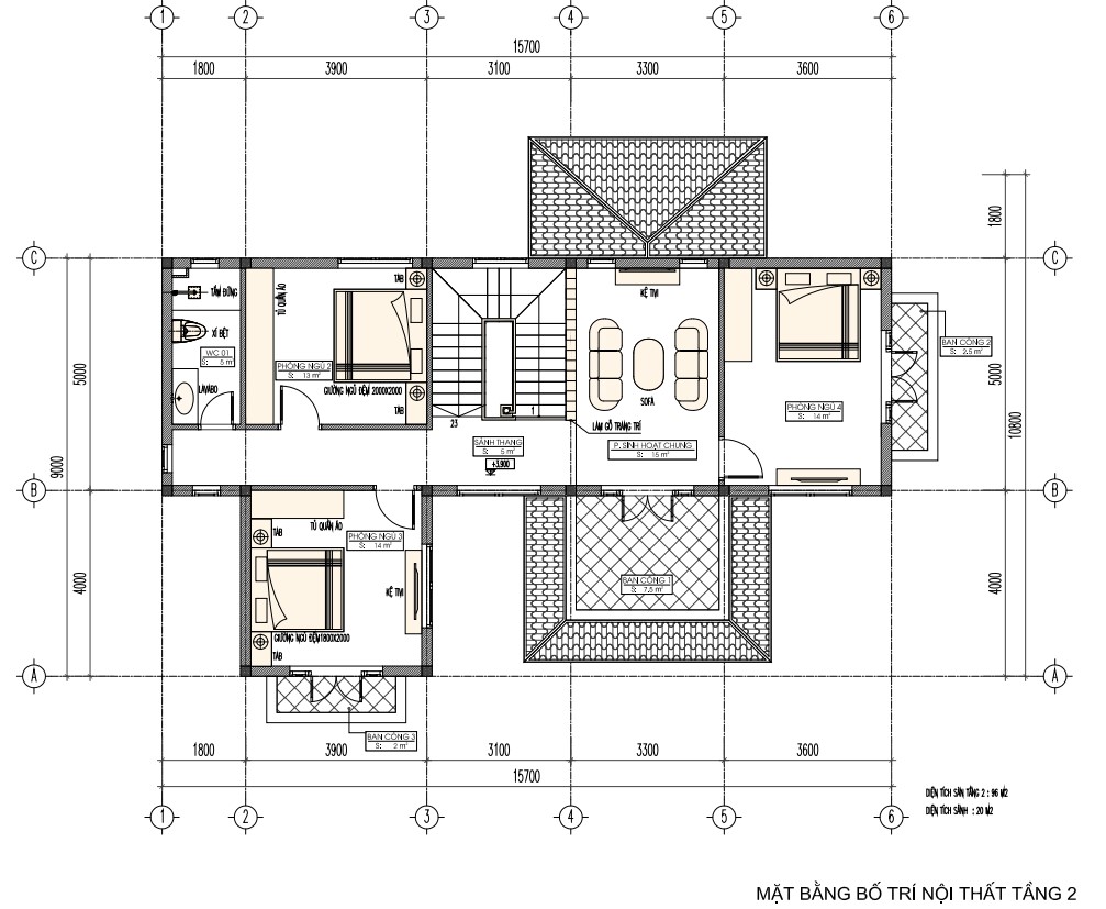 Mặt bằng bố trí công năng tầng 2 mẫu biệt thự 2 tầng diện tích 10,8m x 15,7m