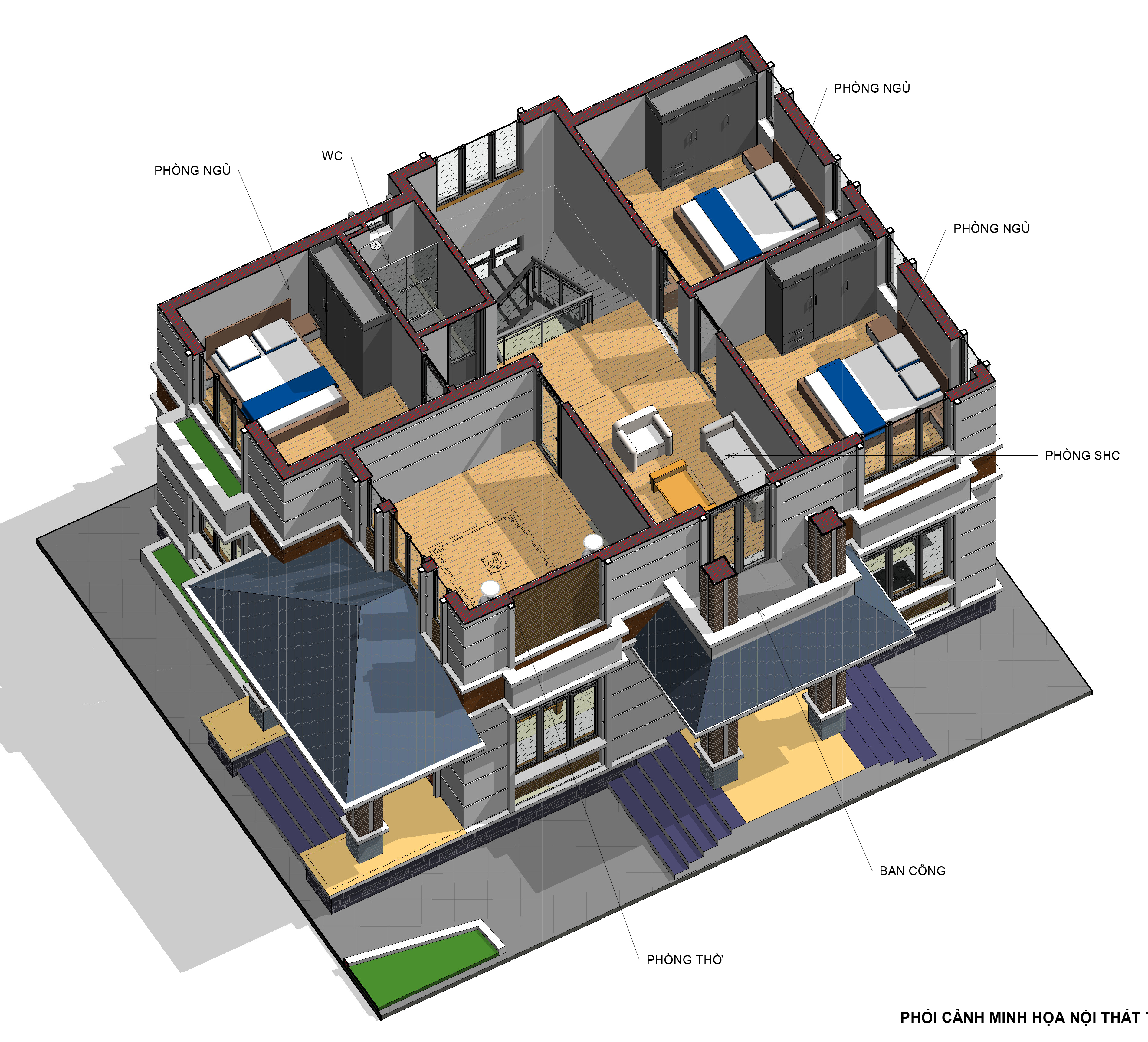 Với việc lựa chọn hệ mái Nhật cho công trình biệt thự hiện đại 2 tầng 5 phòng ngủ, các kiến trúc sư Nhà Đẹp 4.0 đã nghiên cứu rất kĩ càng, dựng phối cảnh 3D sau đó gửi cho gia đình chủ đầu tư cùng xem và cho ý kiến đến khi chốt được kiểu dáng của mái.