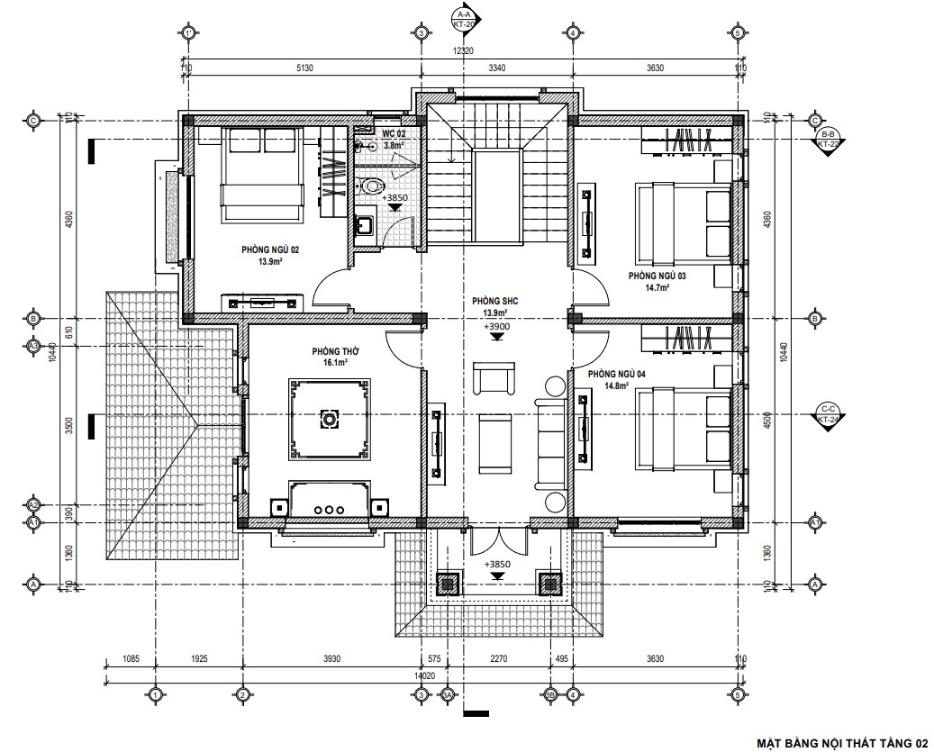 Bước lên tầng 2 đầu tiên sẽ là không gian phòng sinh hoạt chung cho cả nhà rộng 13,9m2. với 2 phòng ngủ phía bên trái (14,7m2). Bên phải còn lại 1 phòng ngủ nhỏ (14m2) cùng phòng thờ 16m2